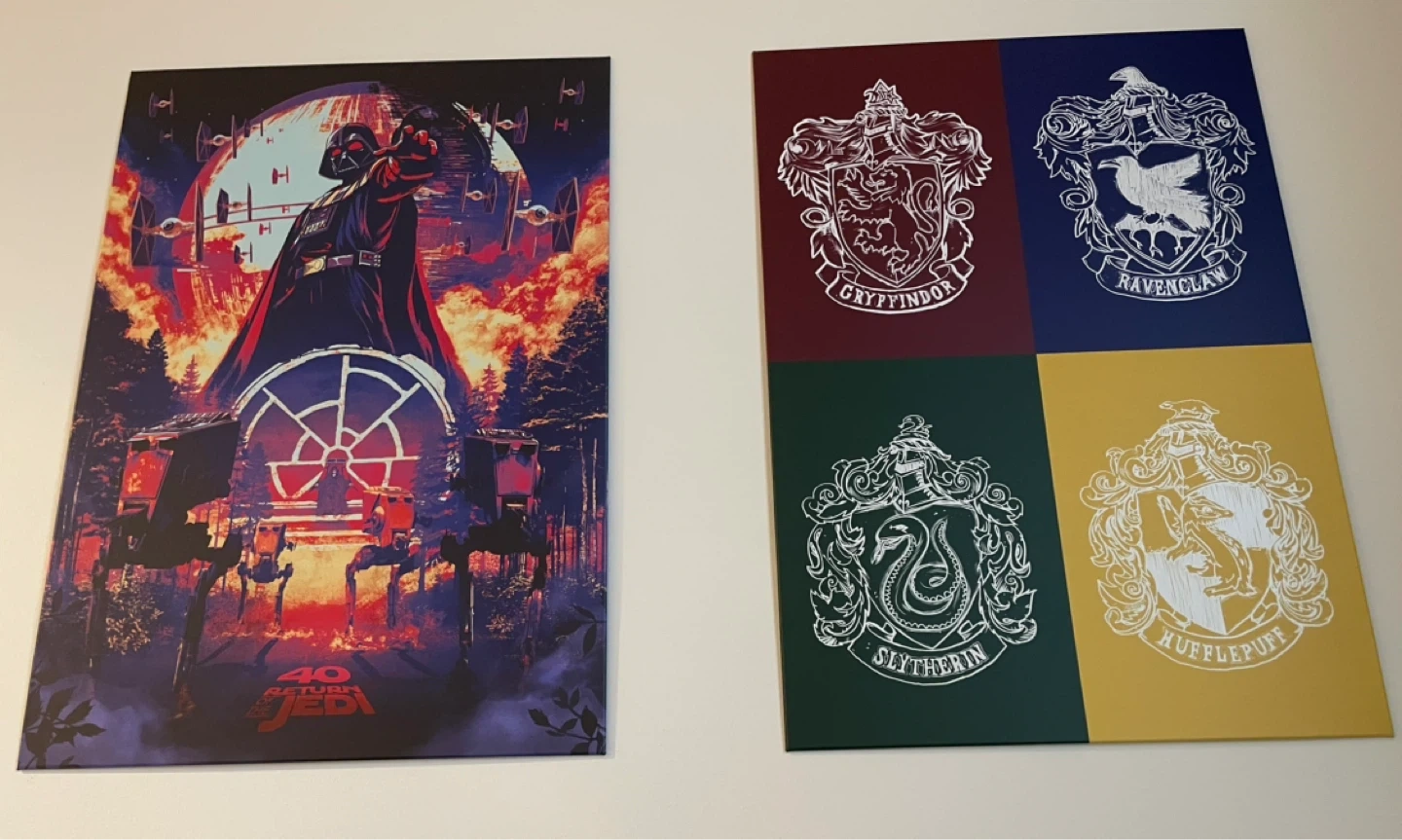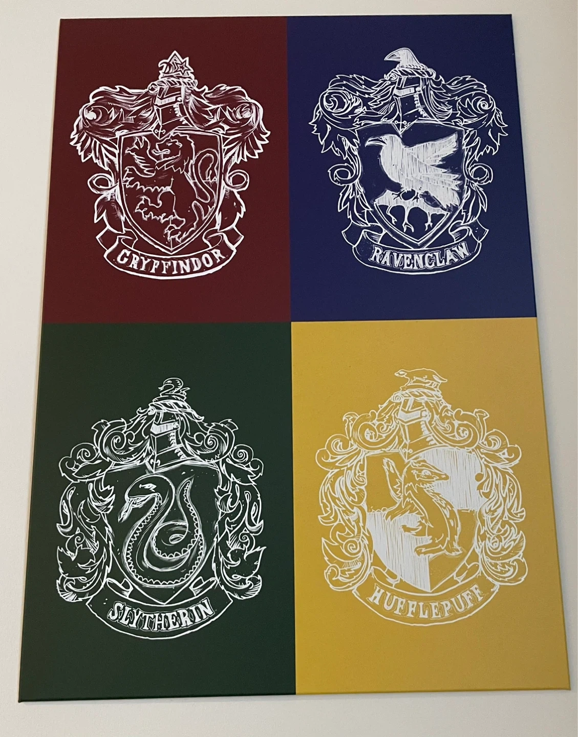 A Harry Potter Hogwarts Houses canvas print with Gryffindor, Ravenclaw, Slytherin, and Hufflepuff crests.