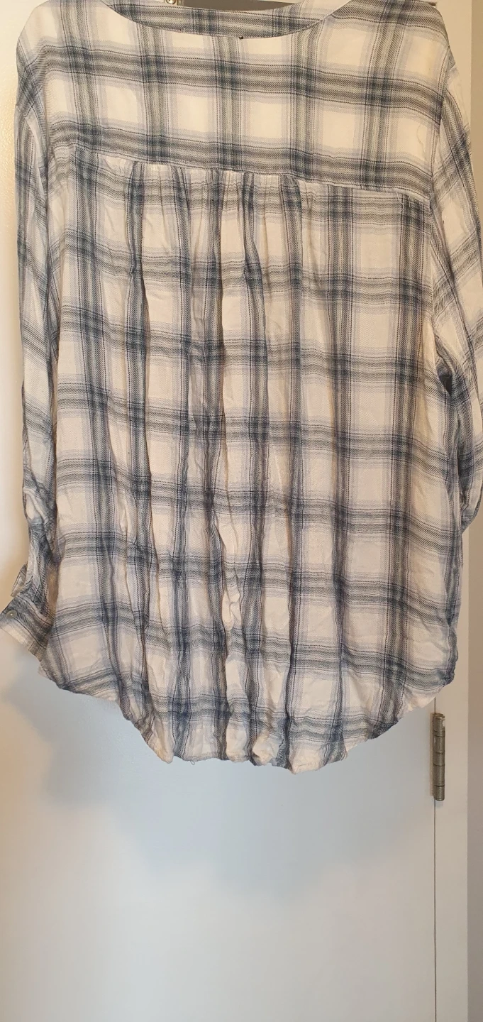 This is a white and blue plaid long sleeve shirt. It features a button-up front and a V-neckline with a small collar. The fabric appears to be lightweight and breathable.