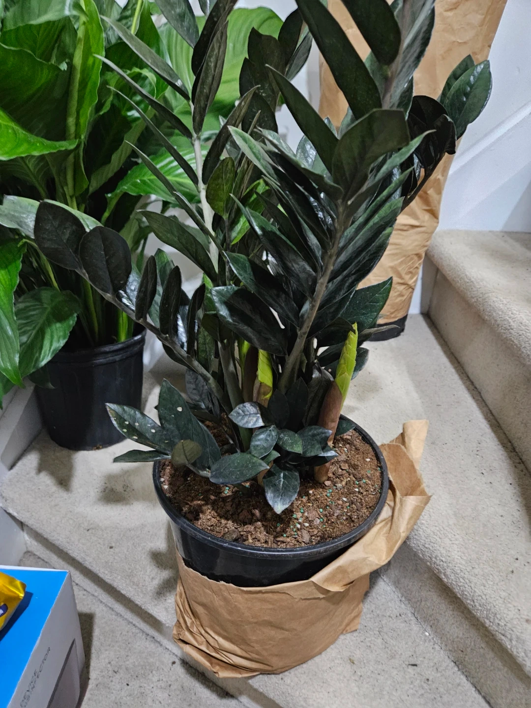 Dark green ZZ plant in a black pot. It's a low-maintenance houseplant known for its attractive glossy leaves. Comes with original brown paper wrapping.