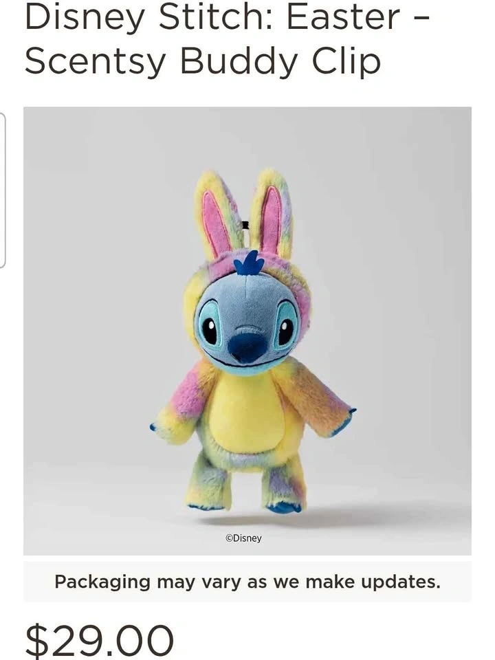 Scented Disney Stitch Easter Scentsy Buddy Clip. Stitch dressed up as a cute bunny. Has a clip to attach to your bag or keys. Super colorful with yellow, pink, blue, and green fur.
