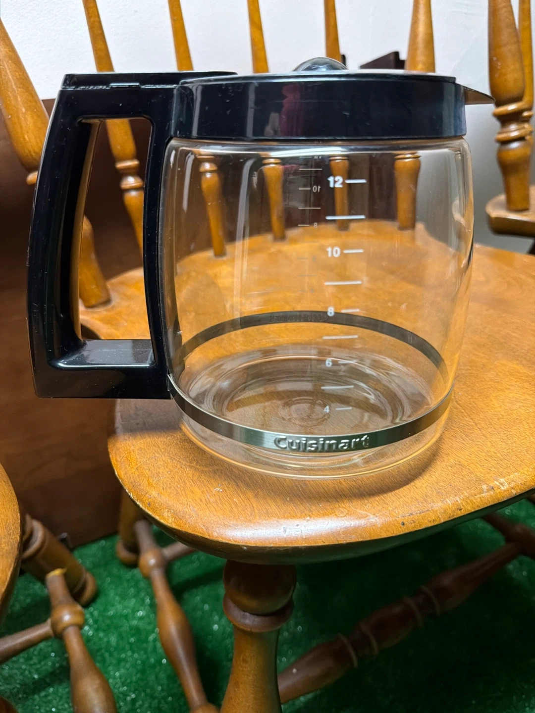 This Cuisinart coffee maker grinds beans and brews coffee automatically. It has a 12-cup carafe with measurement markings. It also includes auto-off and programming functions.