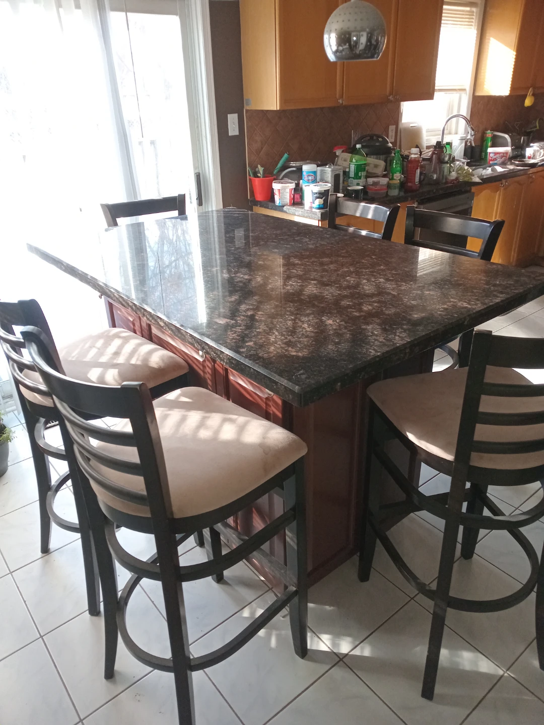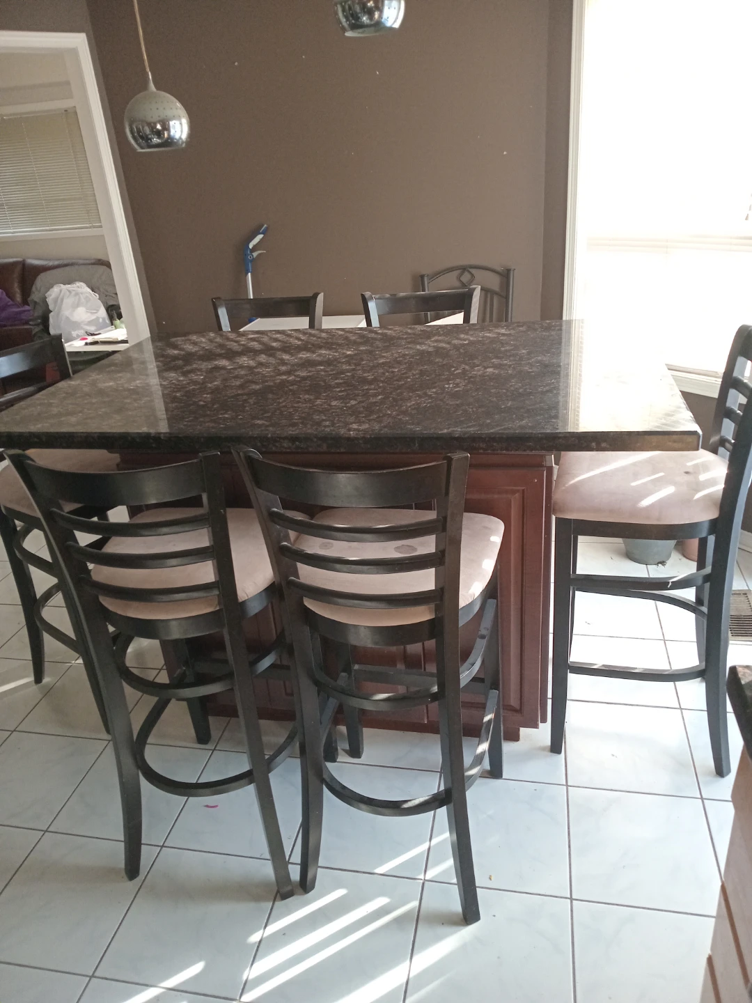 Selling a kitchen island with five bar stools. The island has a dark countertop and a red-brown base. The bar stools are black with beige seats. Great for extra counter space and seating in your kitchen!