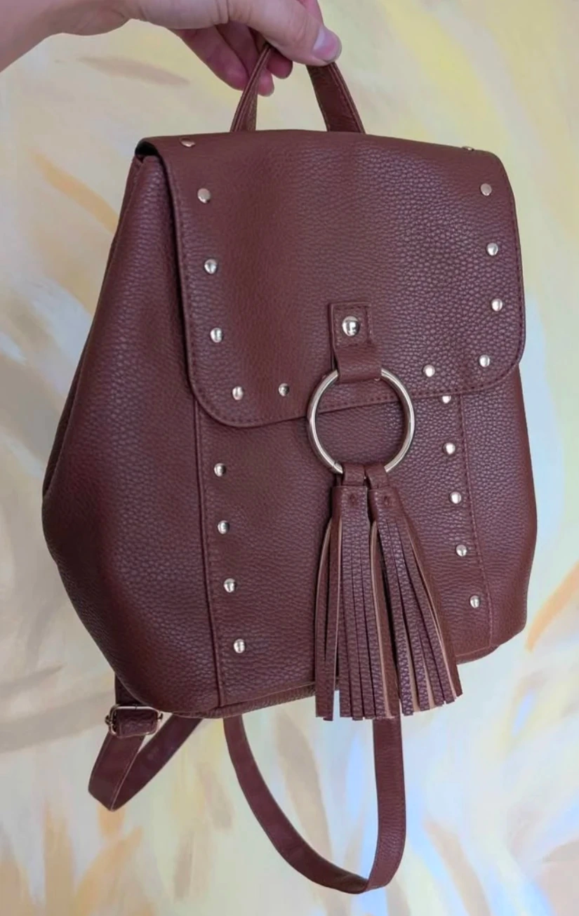 features decorative studs along the front flap. It includes a large ring detail with tassels and adjustable shoulder straps.