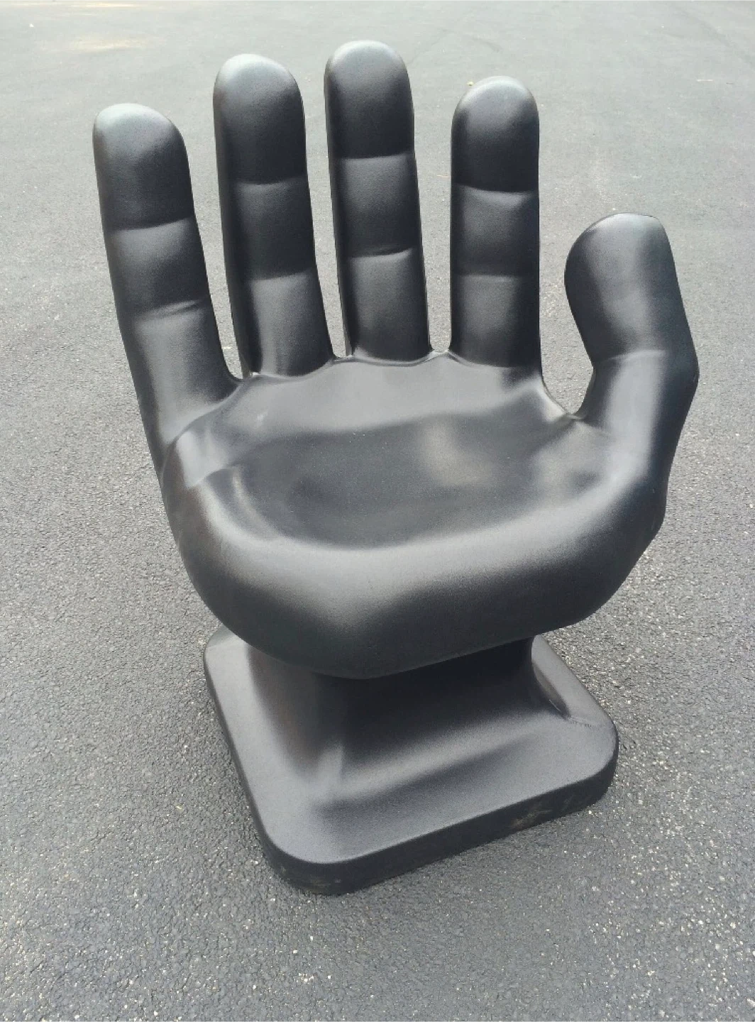 This is a black hand-shaped chair. It's made of a durable material. This chair's unique design makes it a conversation starter!