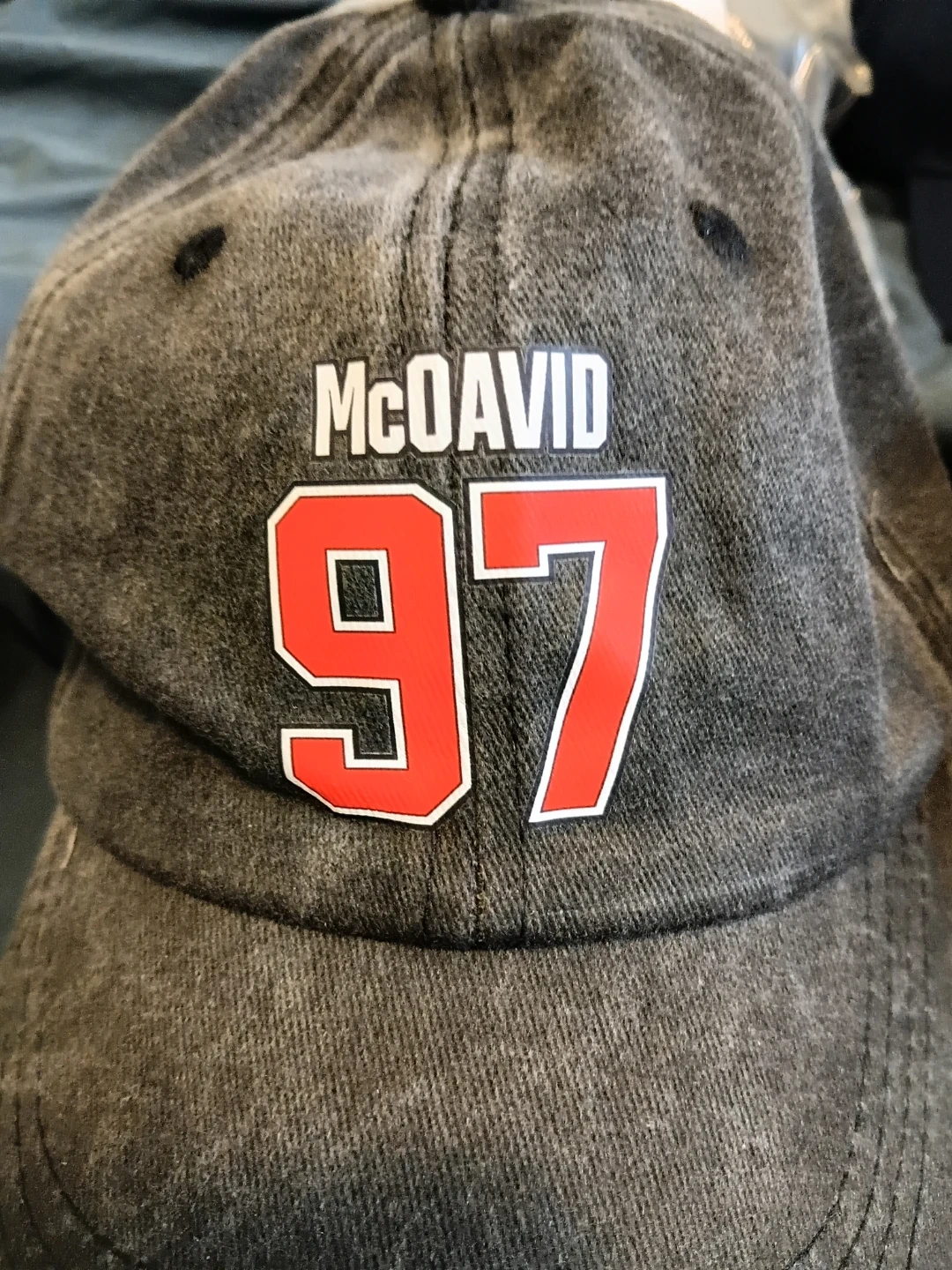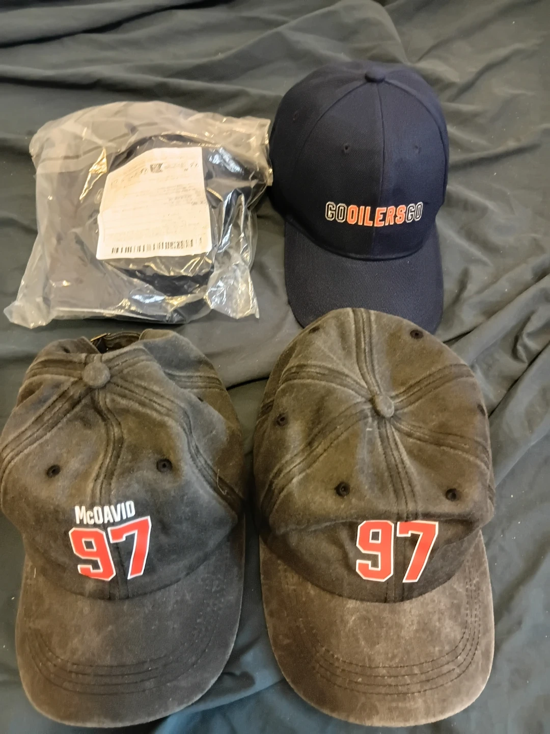 Grey distressed baseball cap with McDavid and 97 printed on the front. Blue baseball cap with 'GOOILERSGO' embroidered on the front.