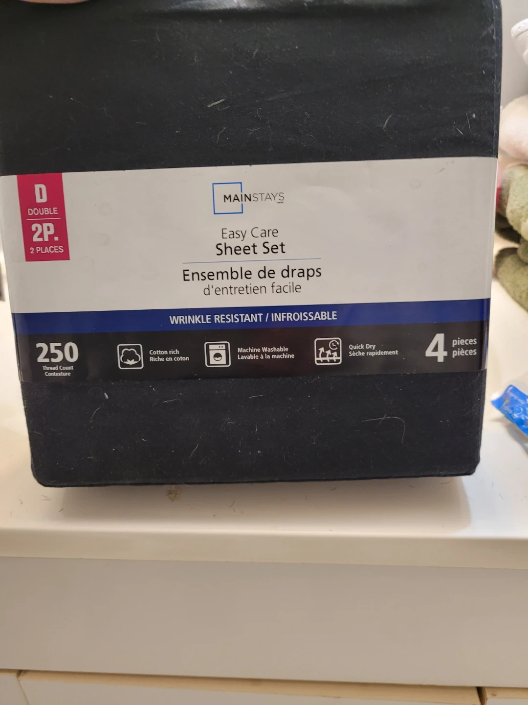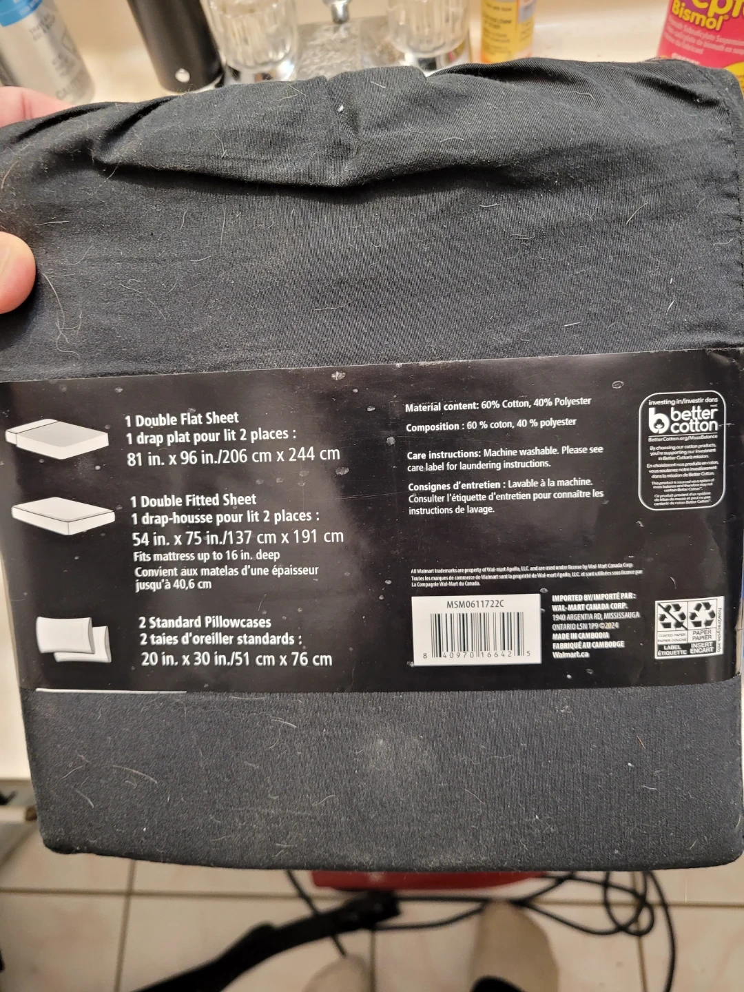 This is a MAINstays Easy Care sheet set in double size. It's wrinkle resistant and made from 60% cotton and 40% polyester. The set includes one double flat sheet, one double fitted sheet, and two standard pillowcases.