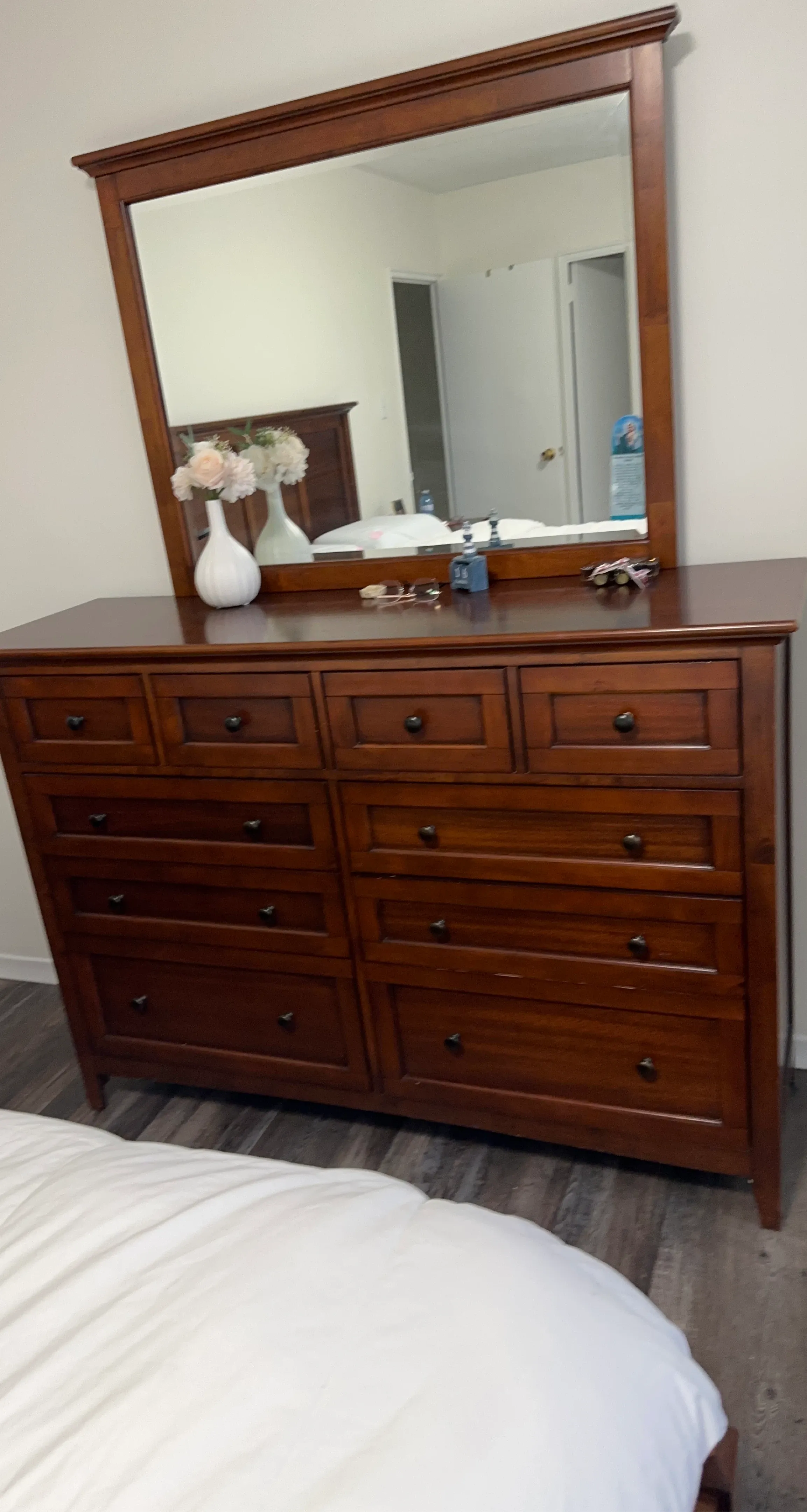 A classic wooden dresser featuring a matching mirror. It has nine drawers for ample storage. This dresser would be useful for organizing clothing and accessories in a bedroom.