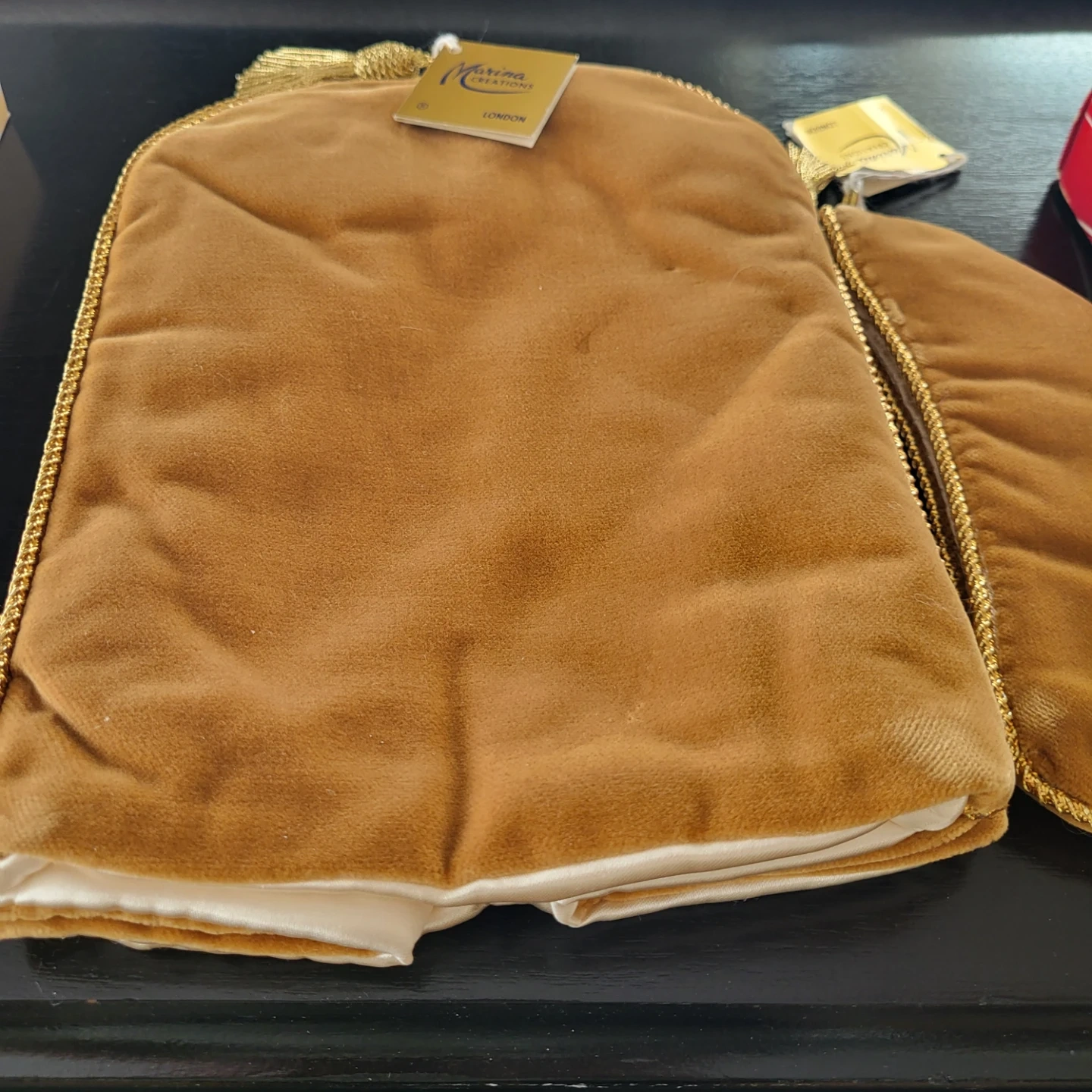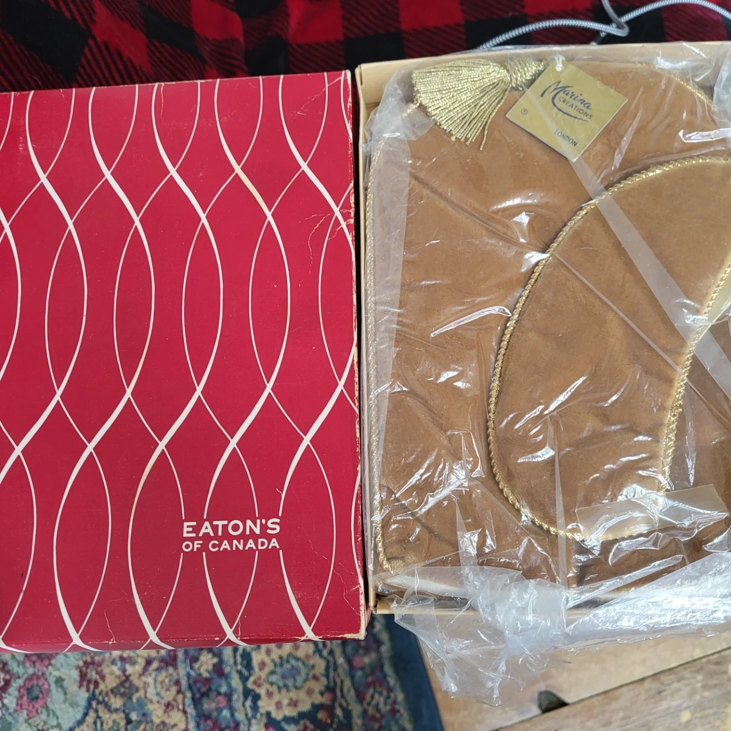 Vintage velvet pouches with gold trim by Marina Creations London. Includes original Eaton's of Canada box. The interior is lined with satin material. Box marked as tea cosy.
