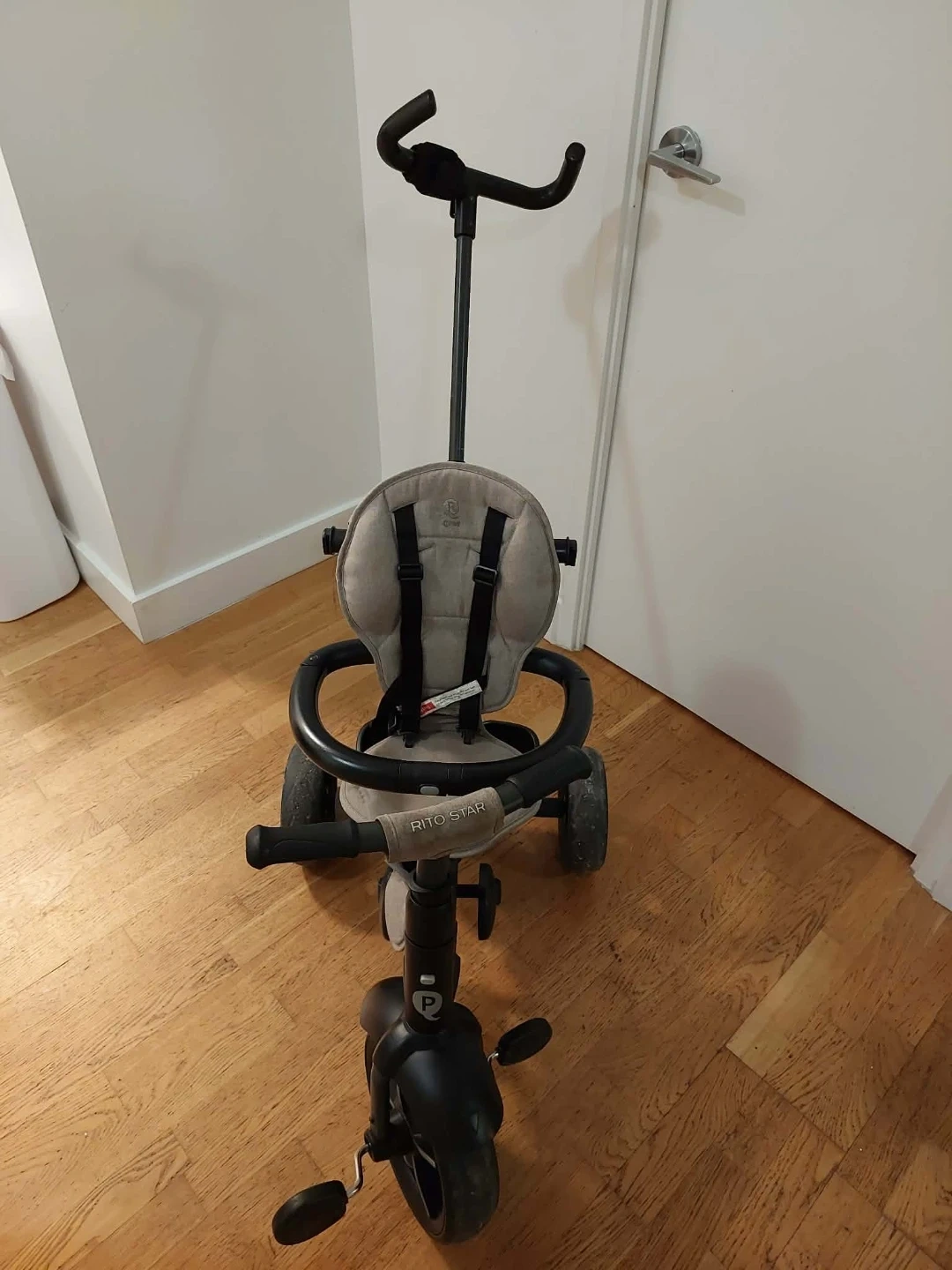 Great for little ones. It features a comfortable seat and adjustable handle, also foldable.It's perfect for outdoor adventures!