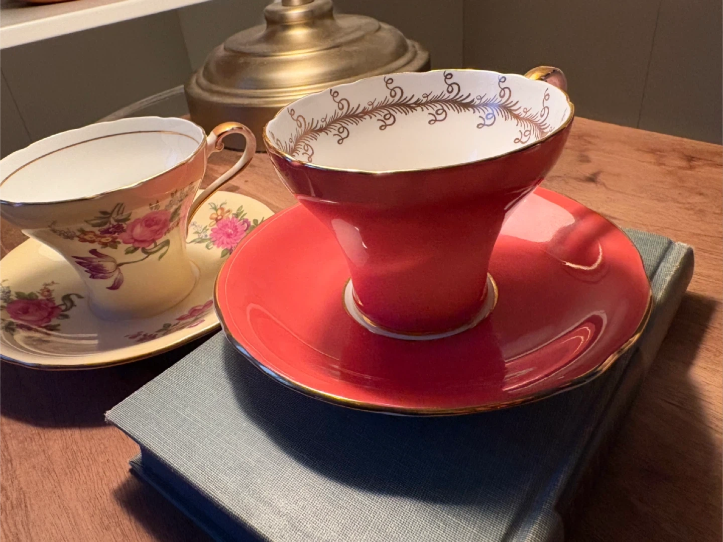 Elegant Aynsley bone china tea cup and saucer set. Features delicate floral patterns on one cup and saucer, and a vibrant red cup and saucer with gold trim. Perfect for a lovely afternoon tea!