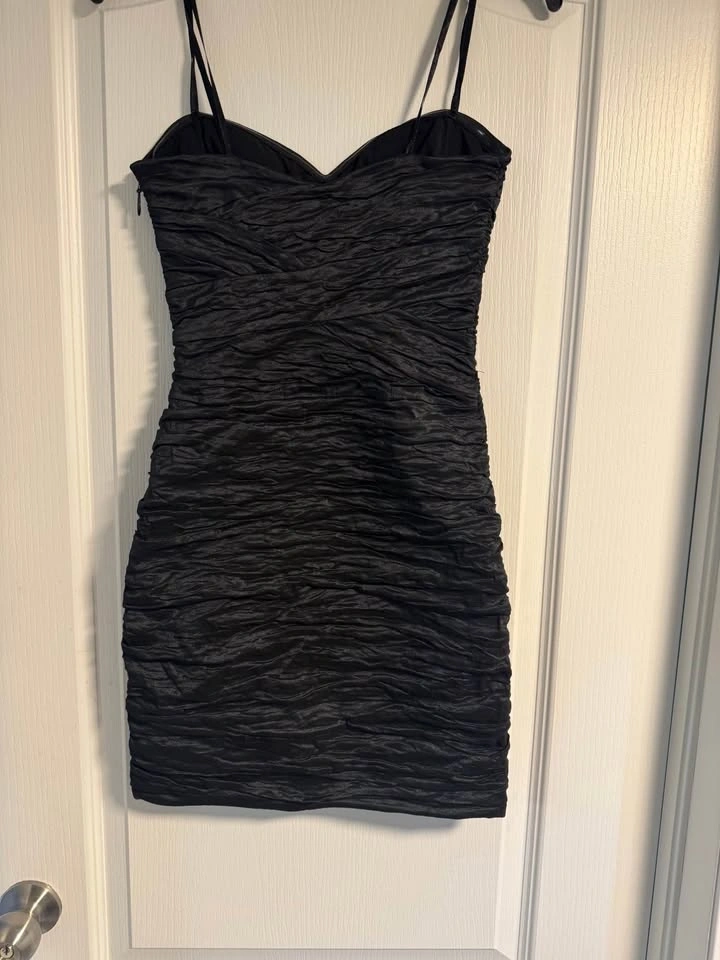 Stylish BCBGMAXAZRIA black ruched mini dress. Size 0. Features spaghetti straps and a sweetheart neckline. Bodycon fit, very flattering.