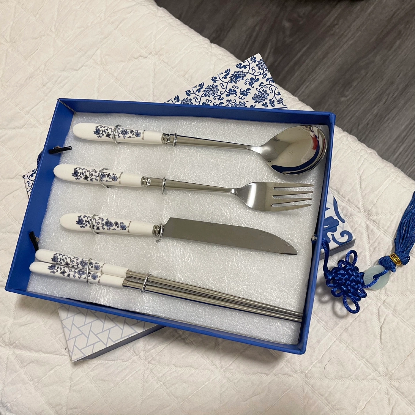 Elegant four-piece cutlery set. Includes spoon, fork, butter knife, and chopsticks. Features blue and white porcelain handles. Presented in a gift box.