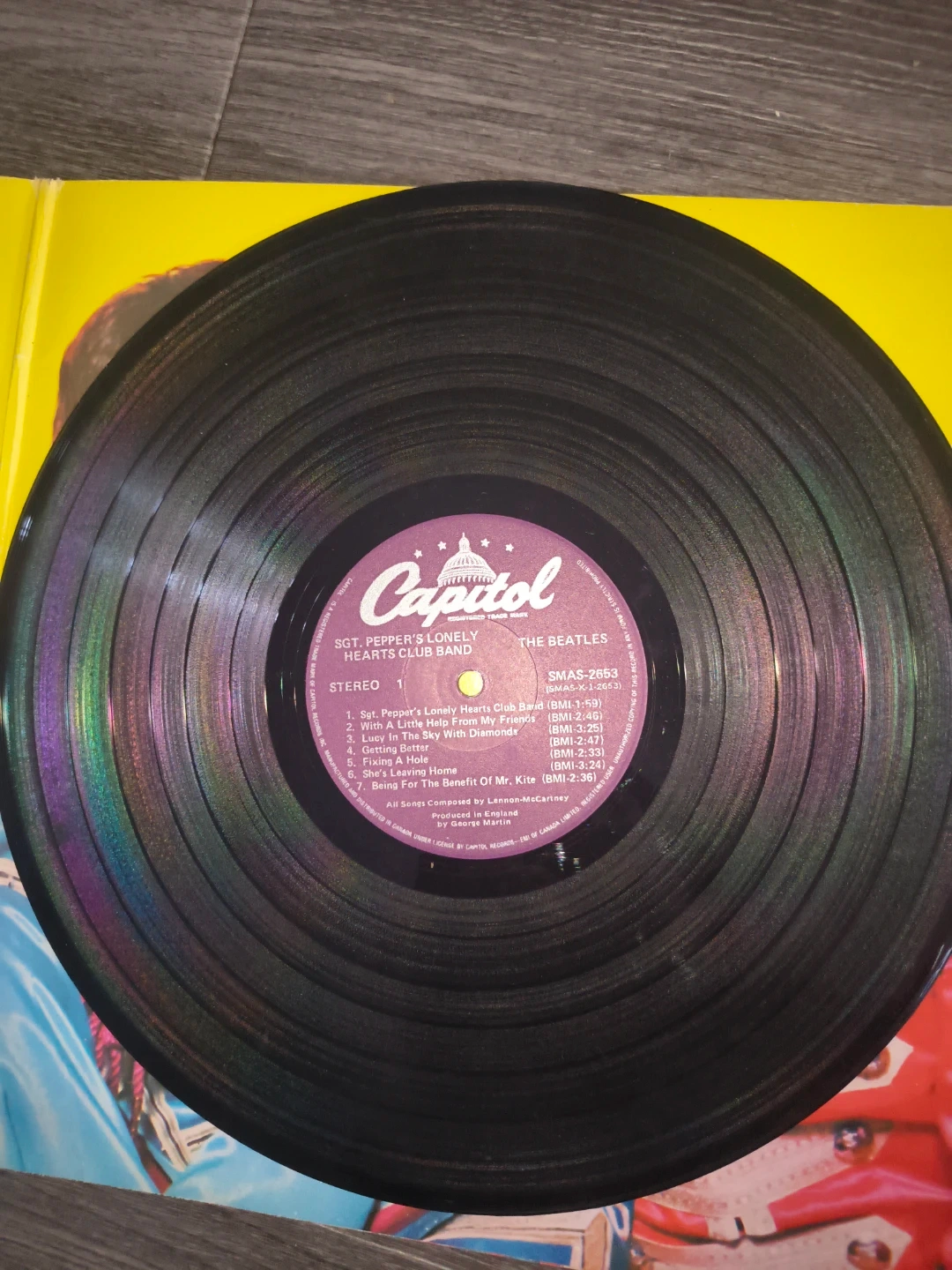 The Beatles' iconic Sgt. Pepper's Lonely Hearts Club Band vinyl record. This Capitol Records stereo pressing features the classic lineup and the full track listing. A must-have for any music collector!