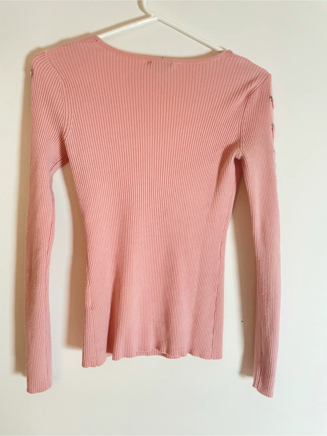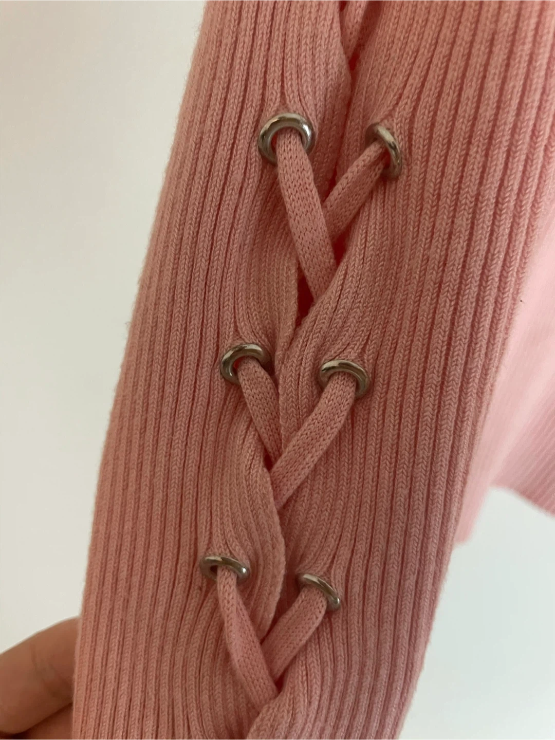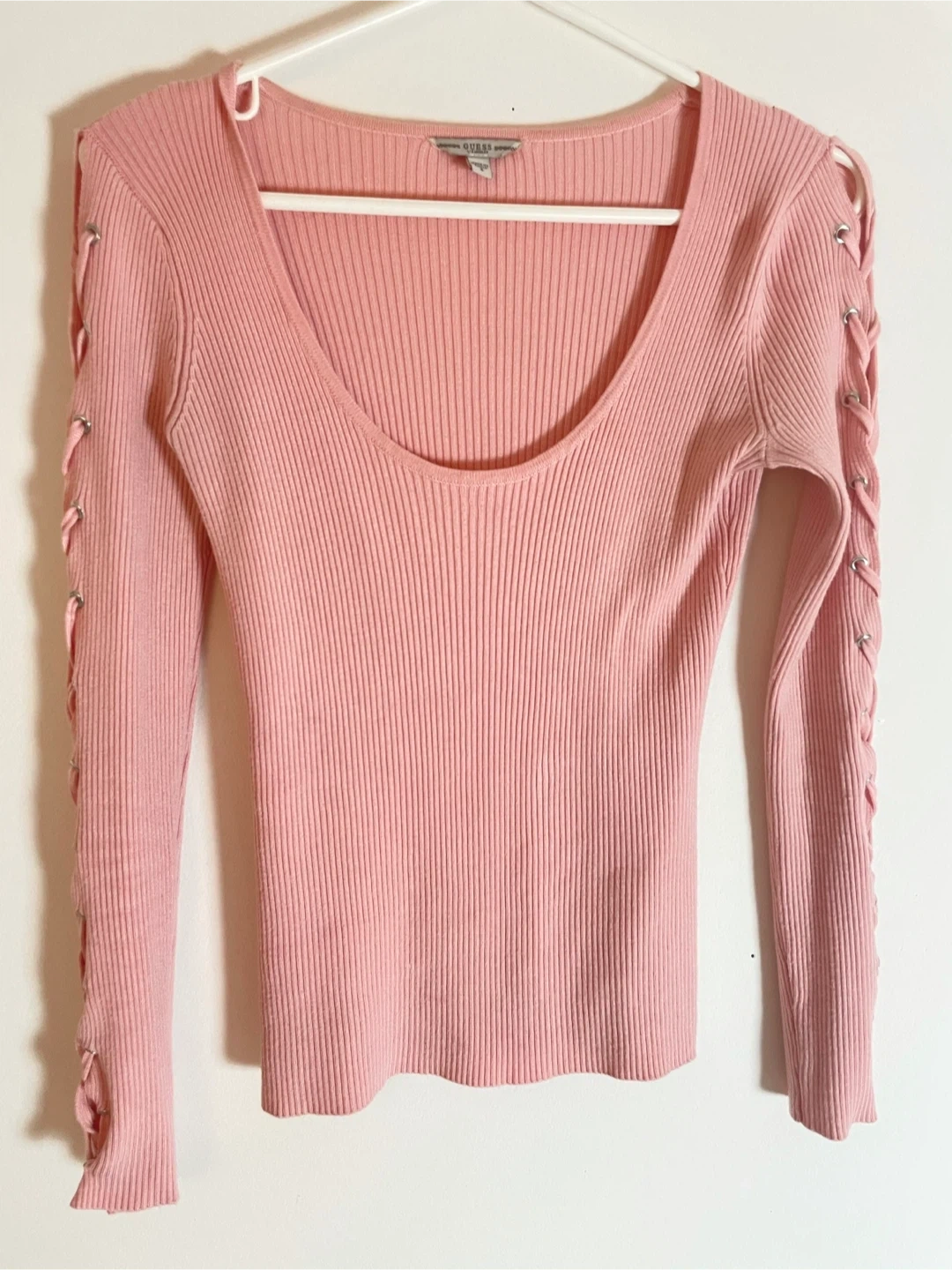 GUESS Pink Ribbed Lace-Up Sleeve Sweater