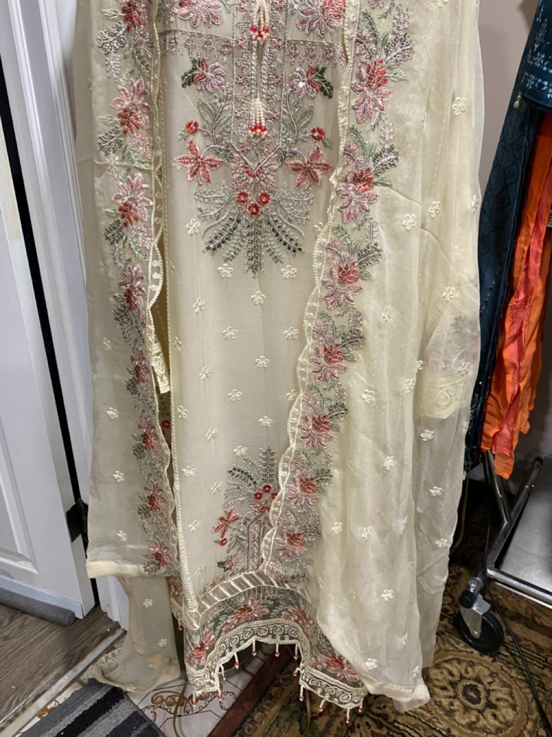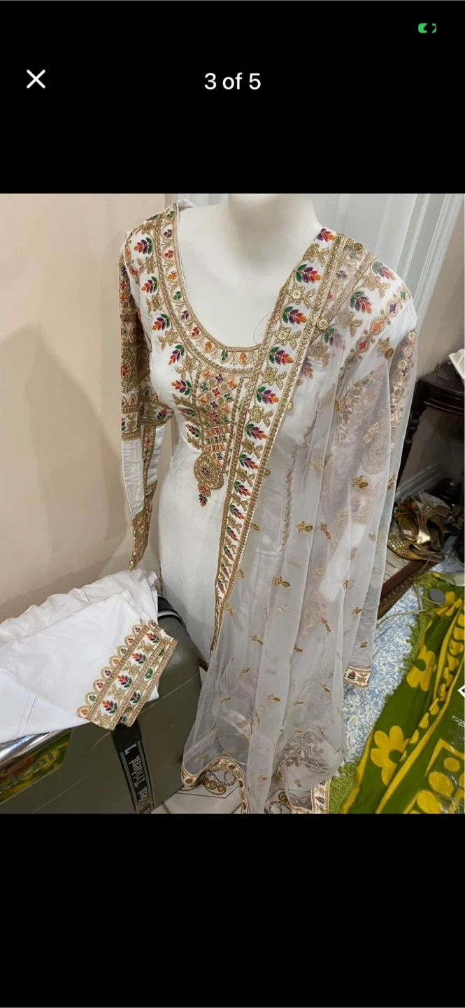 Beautifully embroidered white three-piece suit with a sheer dupatta. Features intricate multi-coloured threadwork and gold detailing on the neckline, sleeves, and hem. Pants are included. Perfect for festive occasions.