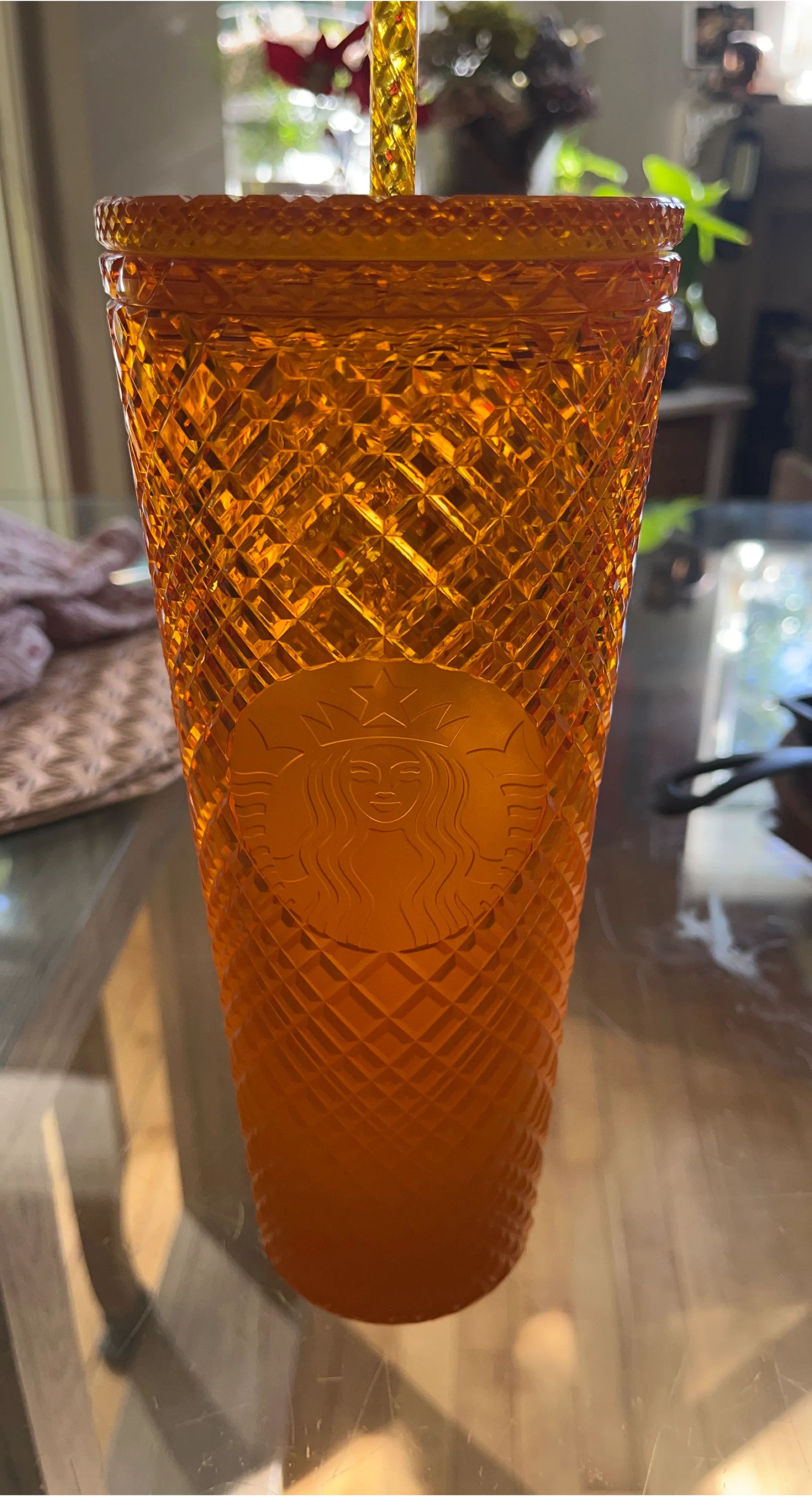 Starbucks tumbler featuring an amber, diamond-patterned design. It's a reusable cup with a matching straw. Great for iced beverages or everyday use!