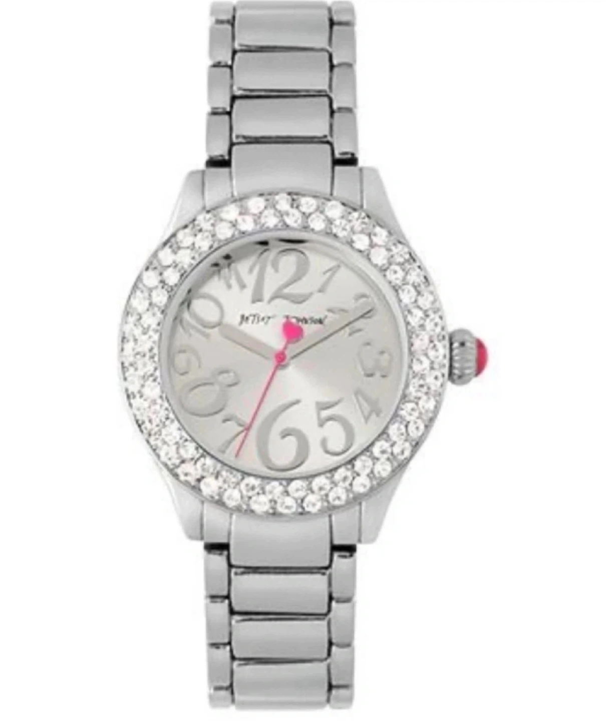 This Betsey Johnson watch features a silver-tone metal band and a white dial. It's adorned with a crystal-encrusted bezel and has large, easy-to-read numbers on the face. The second hand is a playful pink.
