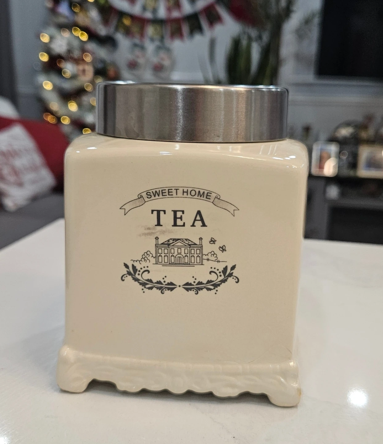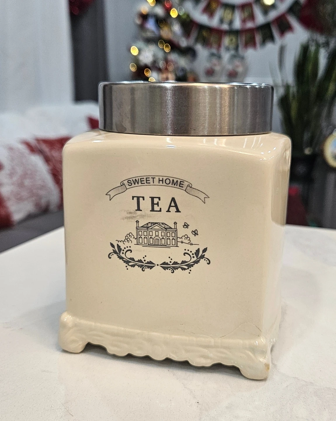 Selling a cute 'Sweet Home' tea canister! It's in great condition and would look lovely in any kitchen. It's a creamy white colour with a silver lid, ready to store your favourite tea bags or loose leaf tea
