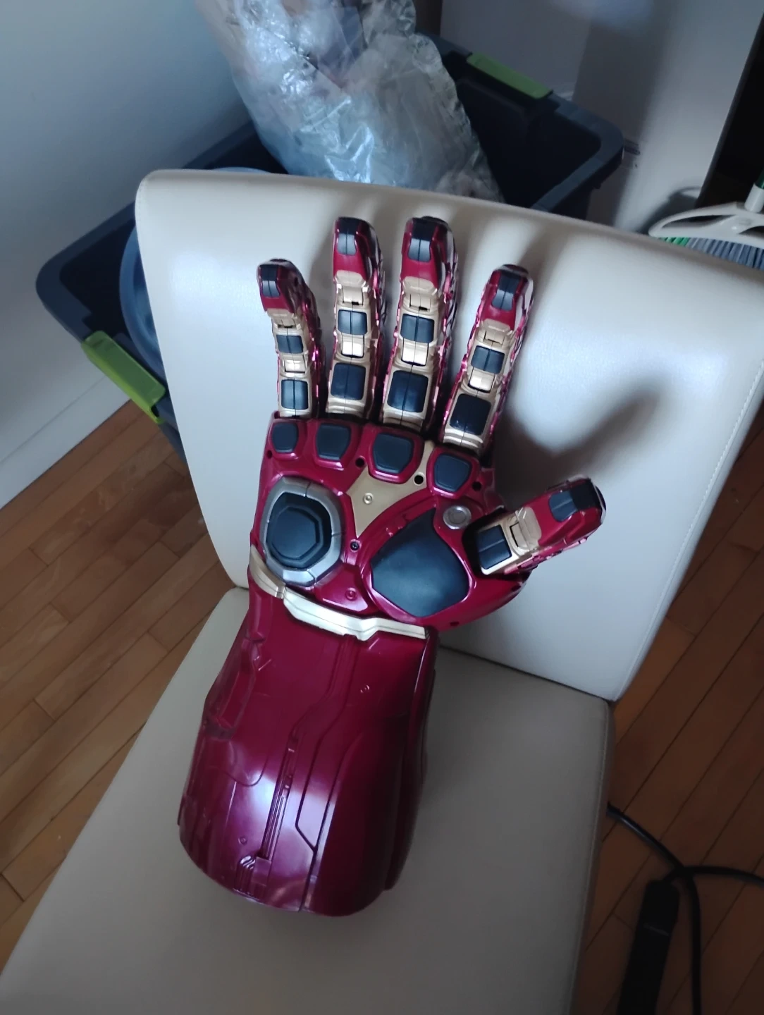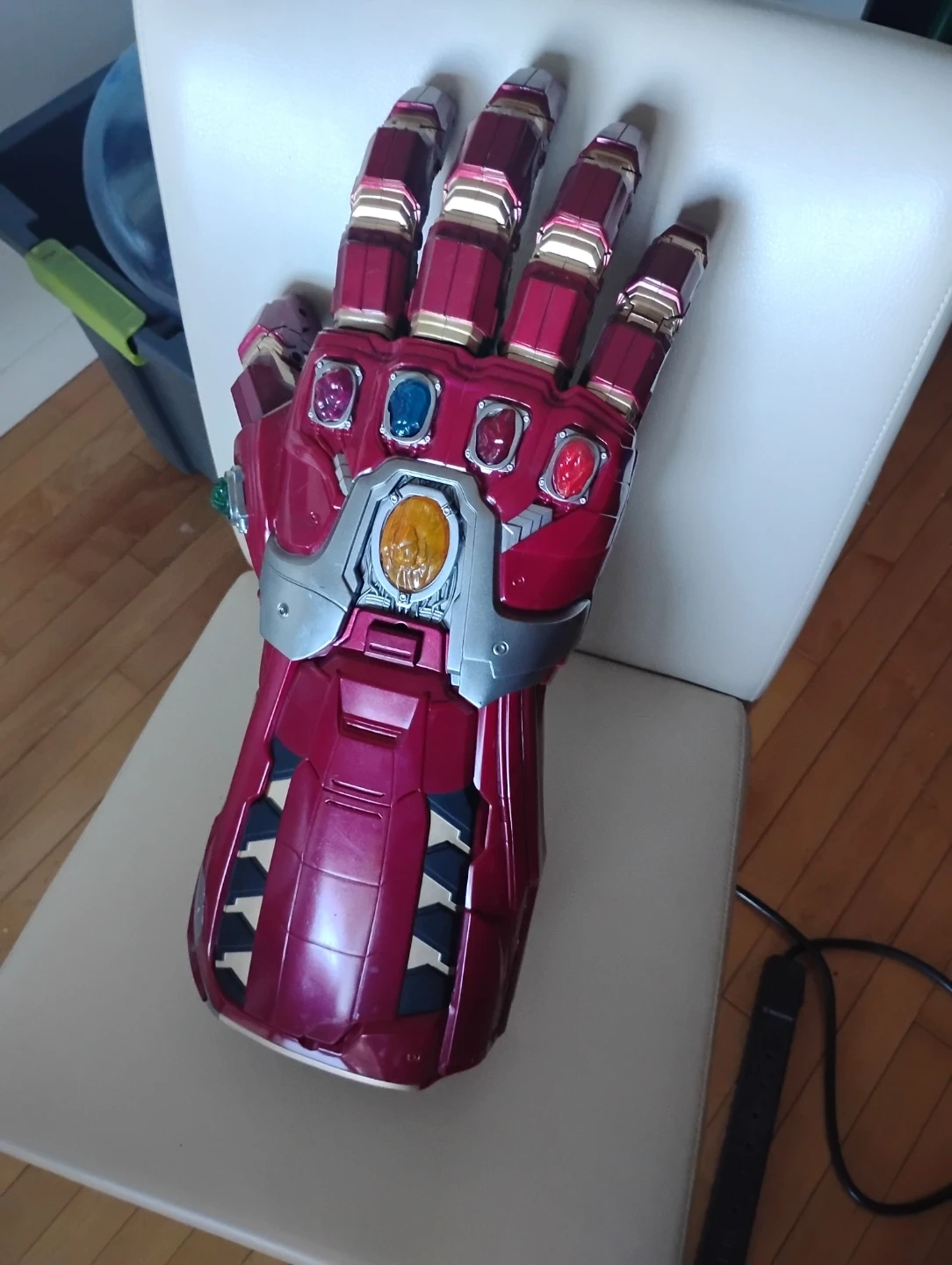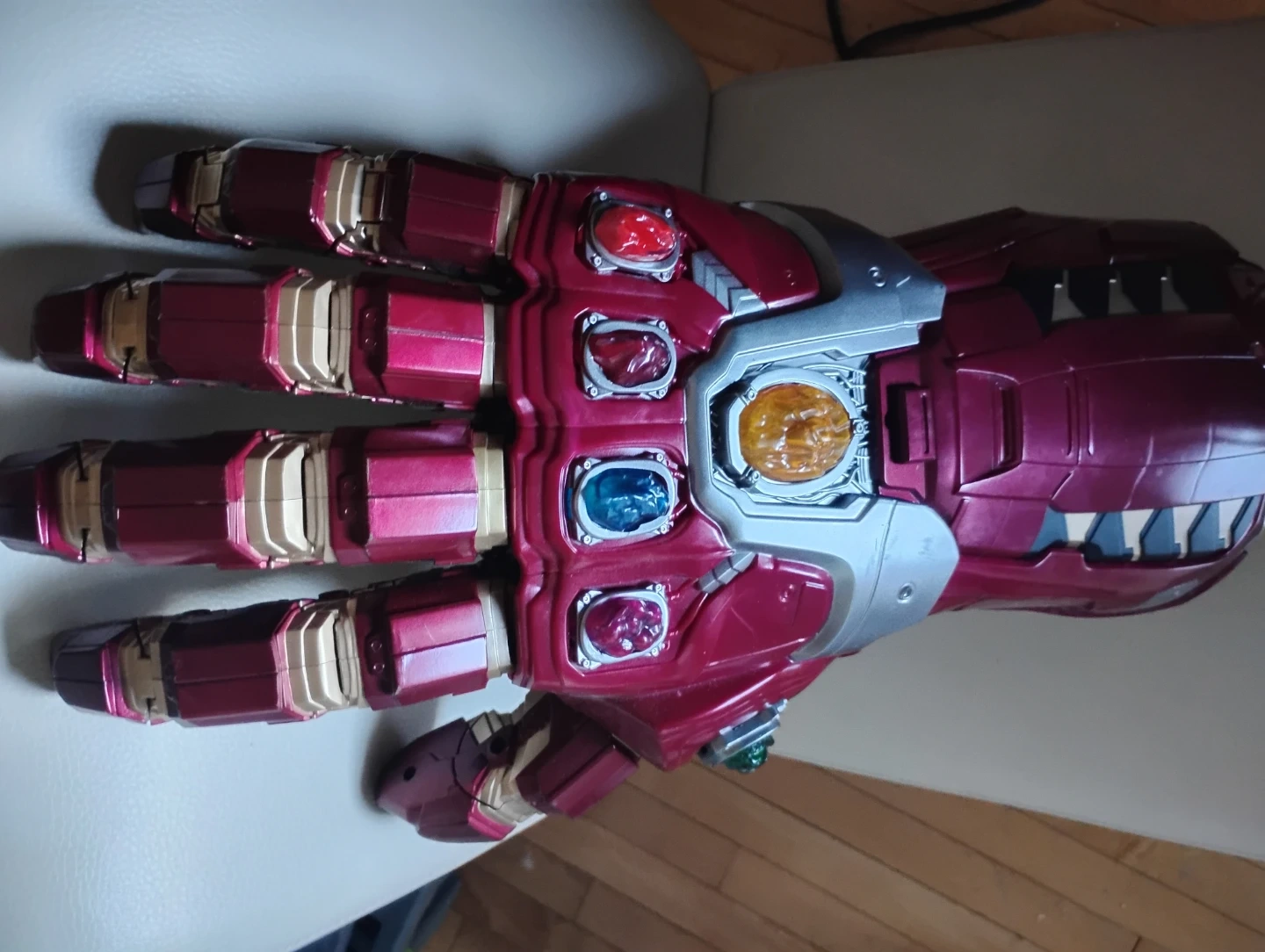 This is an Iron Man Infinity Gauntlet toy. It's designed to resemble the gauntlet from the Marvel movies. The Infinity Stones are visible on the fingers and palm. Battery powered, was 200