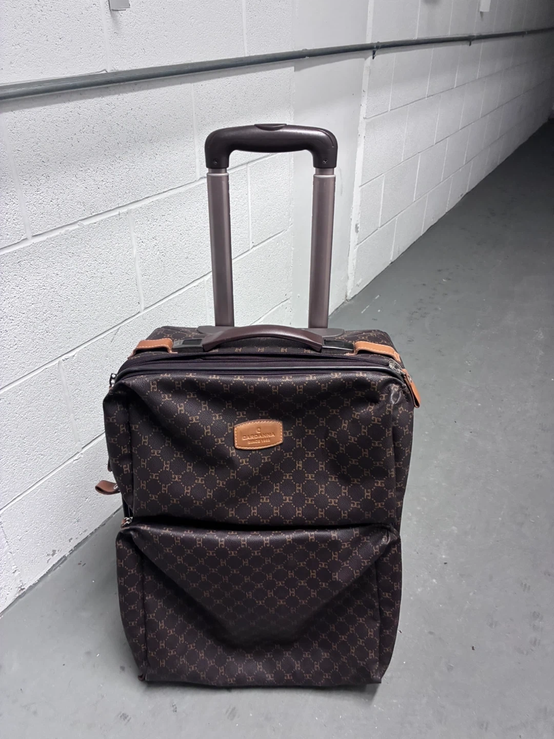 This is a CARDANNA rolling suitcase with a brown monogram pattern. It features a retractable handle and has two main zippered compartments. It's a great size for weekend trips or carry-on luggage!