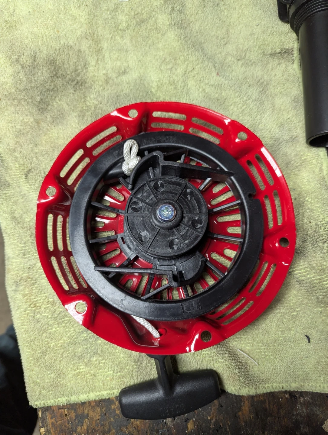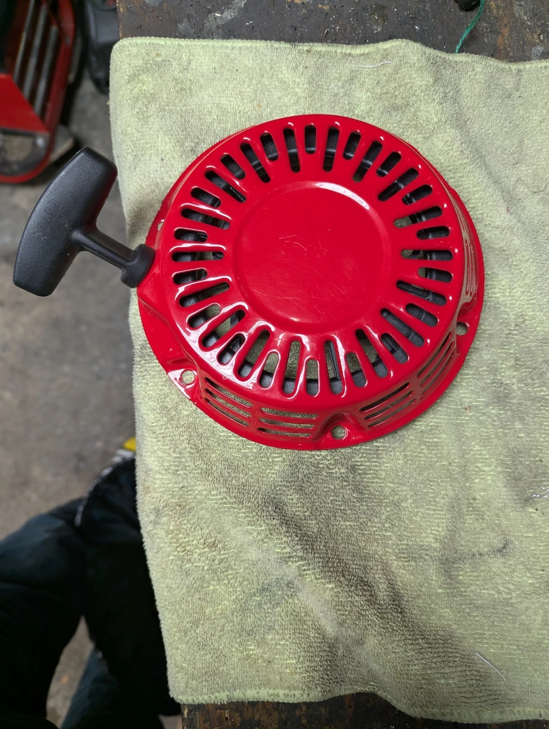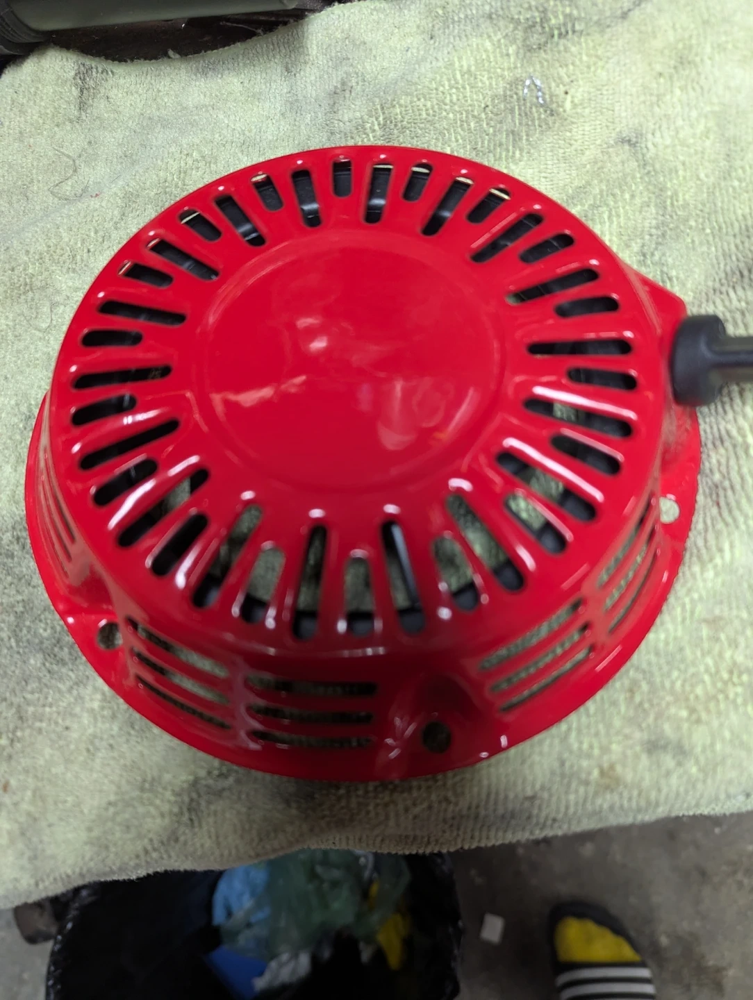 Red recoil starter assembly with black handle and pull cord. It measures approximately 7 inches in diameter. This part is commonly used for small engine equipment.