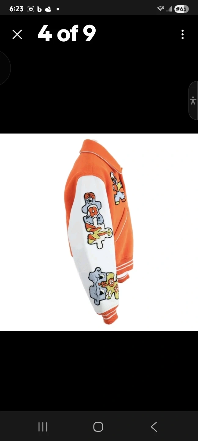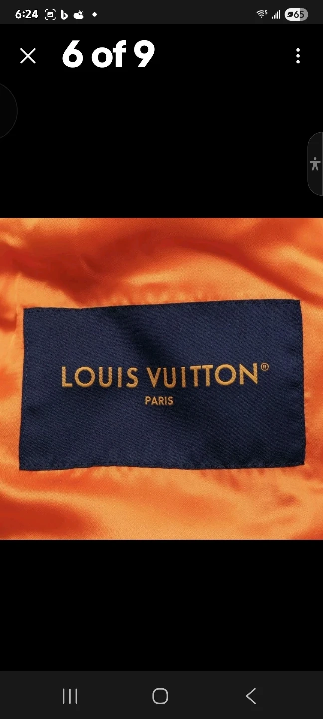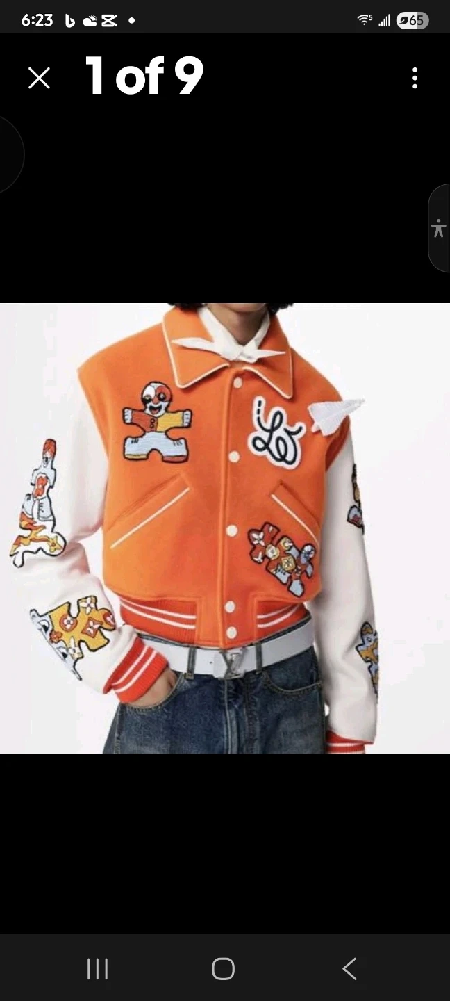 This is a Louis Vuitton varsity jacket in orange and white. It features embroidered patches and a classic collegiate design. The interior lining is bright orange.