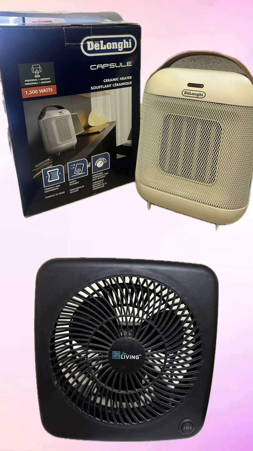 Selling a De'Longhi Capsule ceramic heater (1500W) and a compact desk fan. Both in great working condition. Perfect for staying warm in winter and cool in summer.