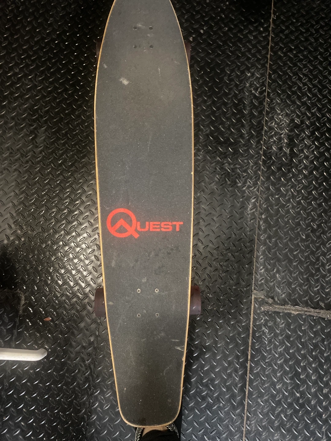 This is a Quest longboard skateboard. It's a good board for cruising around. The deck is made of wood with a cool black and tan stripe design. Red wheels included.