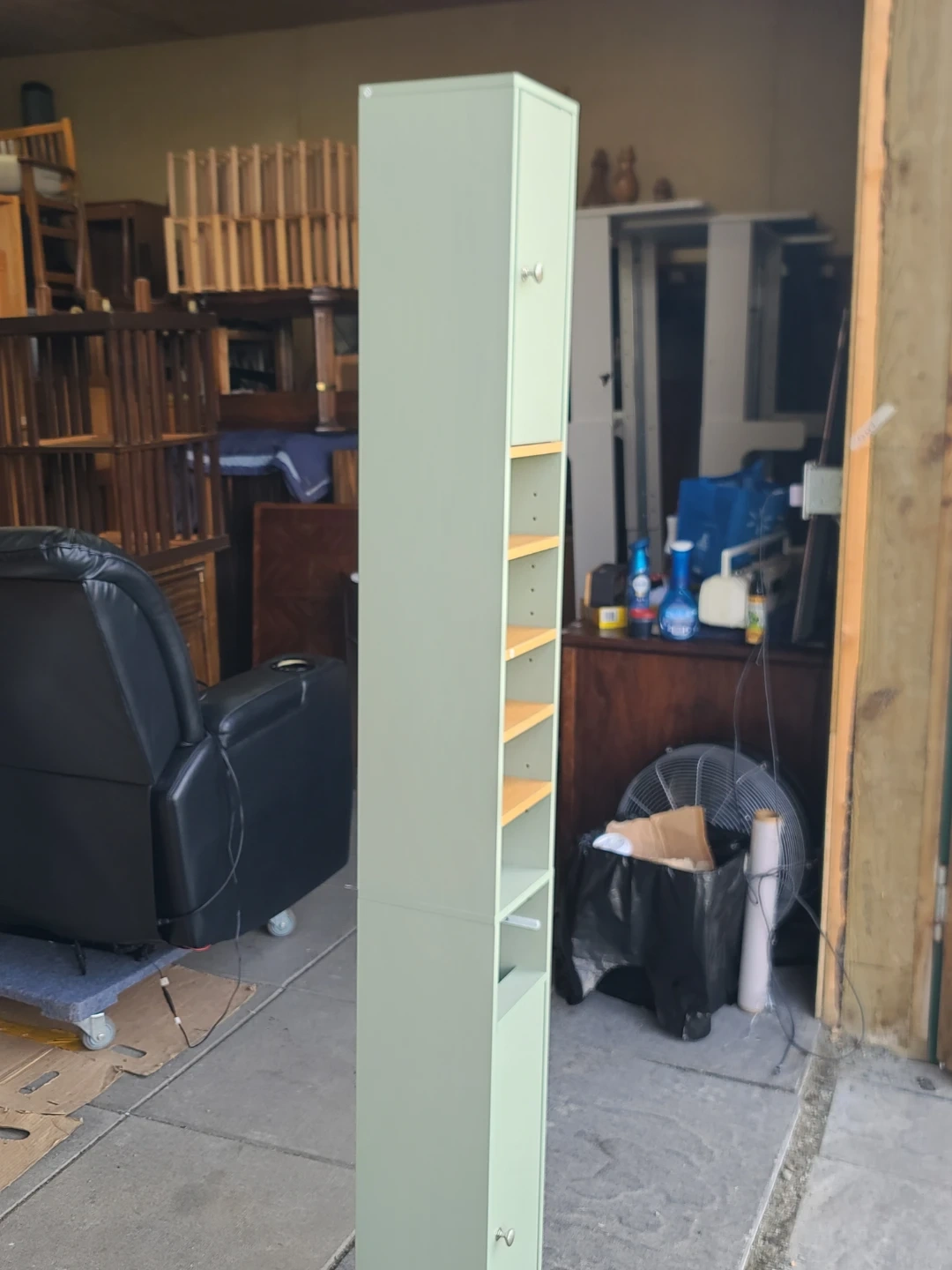 Slim storage unit. Has two closed cabinet sections, one on top and one on bottom. Middle section has open shelves, great for displaying stuff or extra storage. Light mint green color. Measurements: W 8' X D 8" X H 71". Delivery can be arranged. Viewing and pickup by appointment.