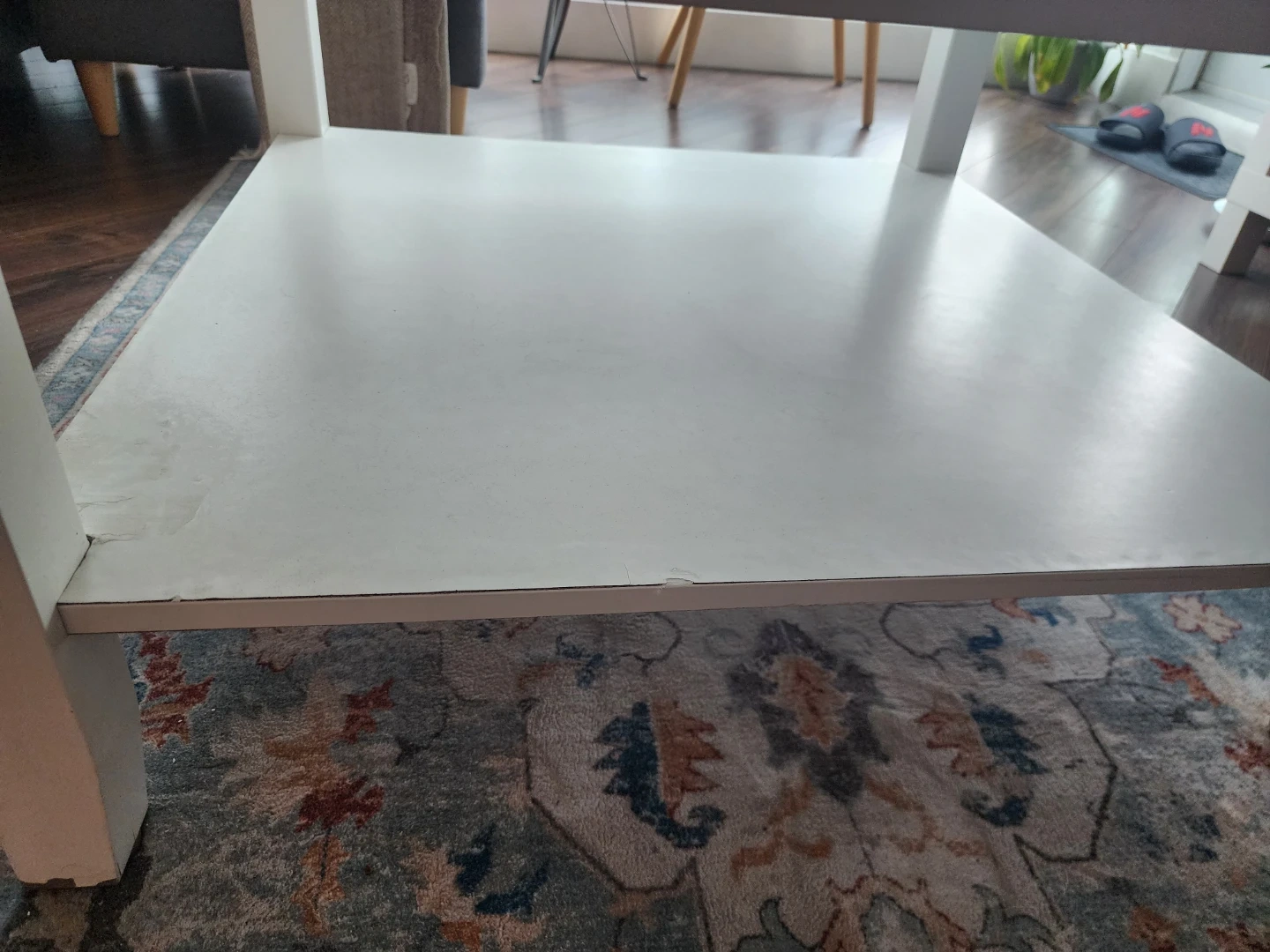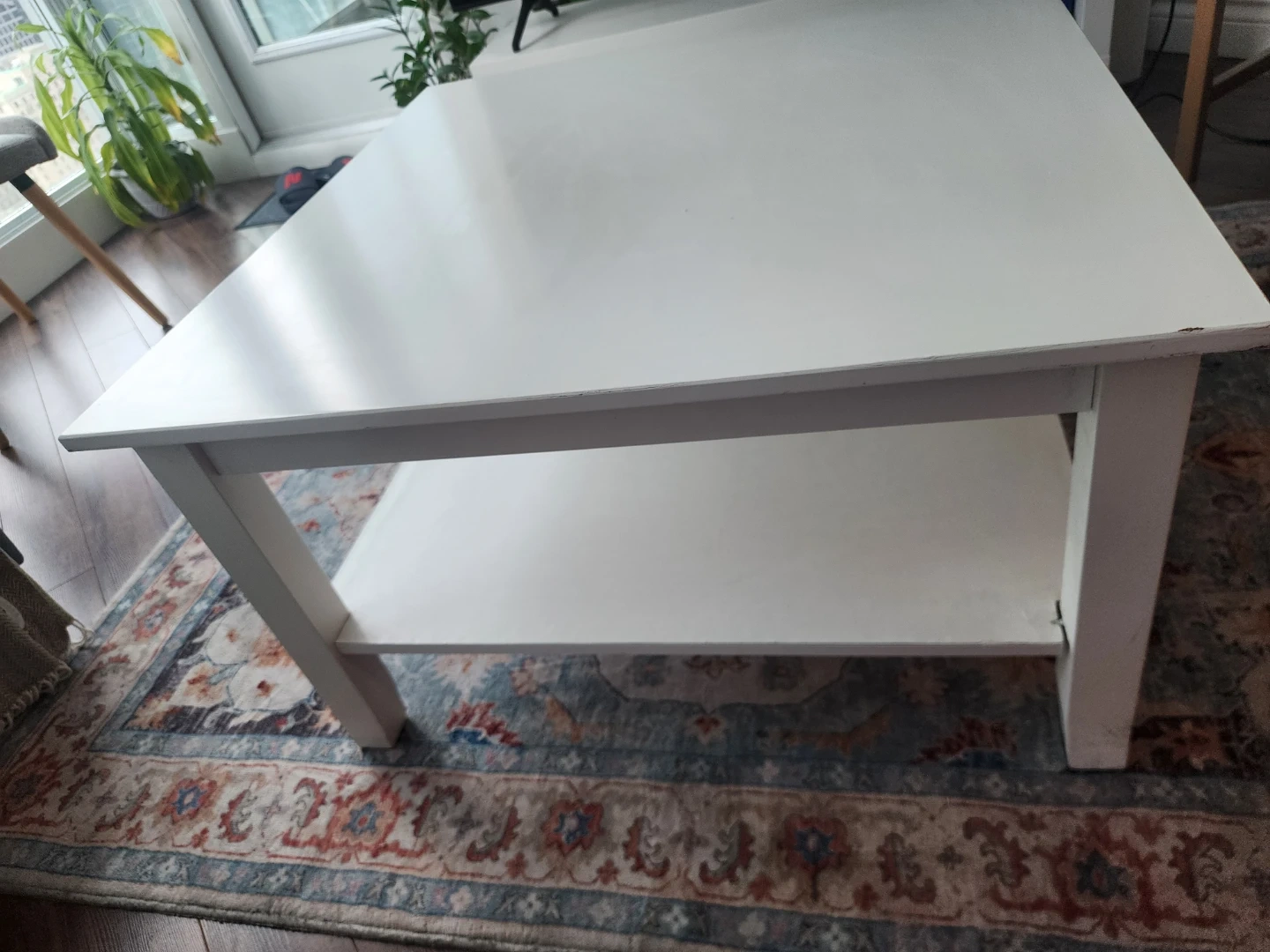 Selling a white coffee table that's perfect for any living room! It features a handy shelf underneath for extra storage. The table is 31.5" x 31.5" and 18.1" tall. There are some signs of use, but it's still in good condition!