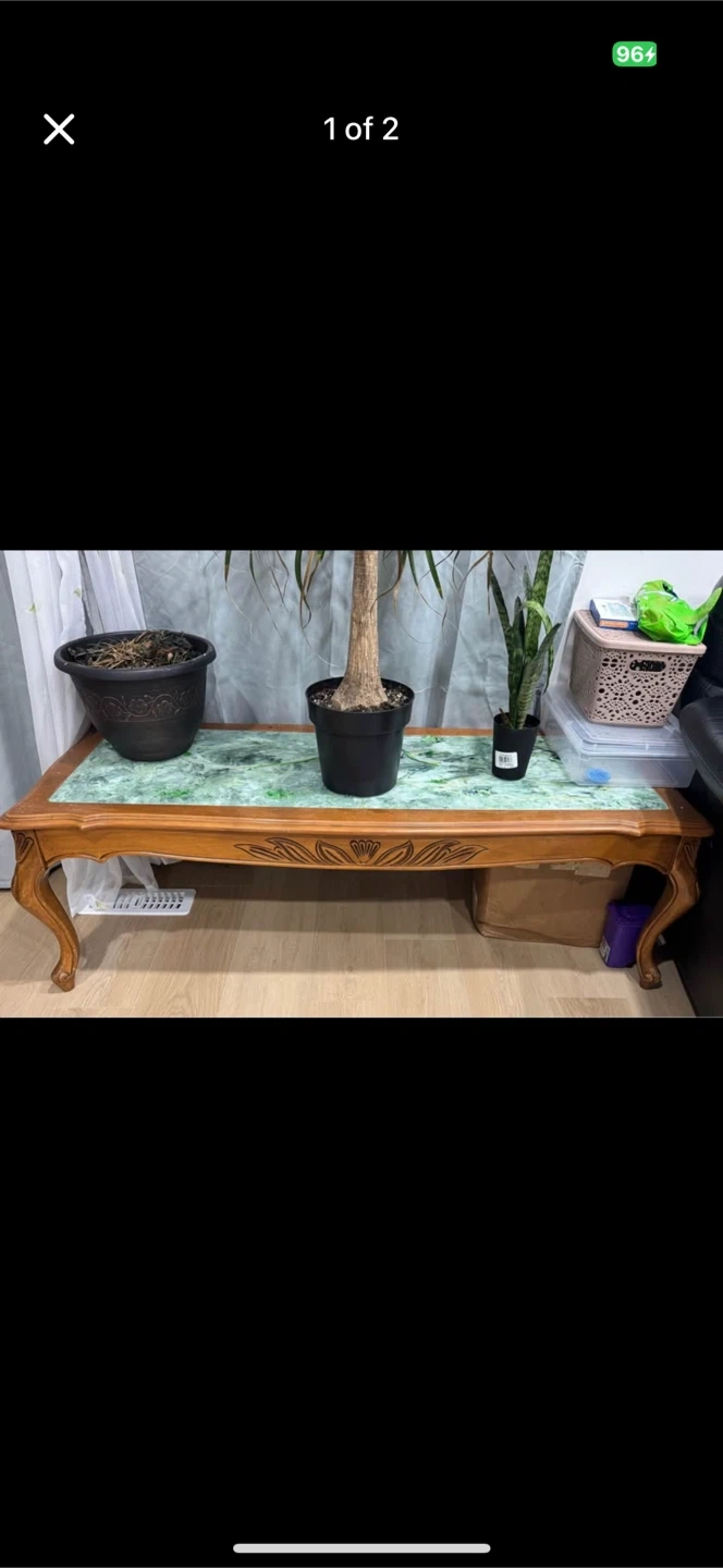 Beautiful vintage coffee table featuring a green marble inlay top and ornate wooden legs. It's a substantial piece that adds classic charm to any living space. The wood has a warm finish and the marble has a lovely unique pattern.