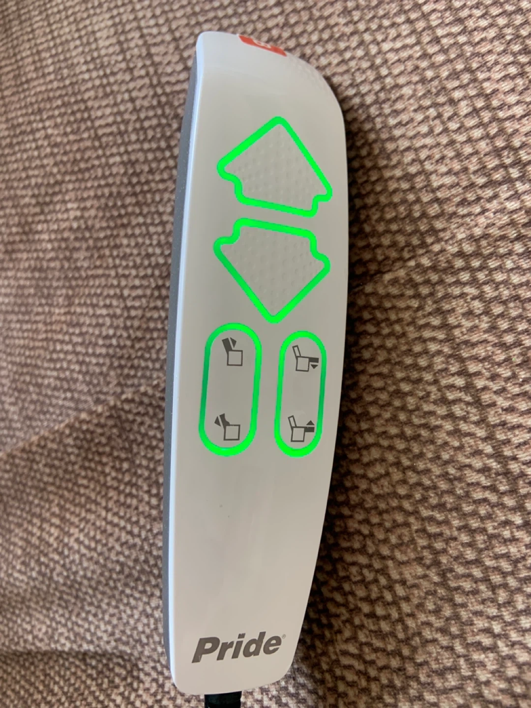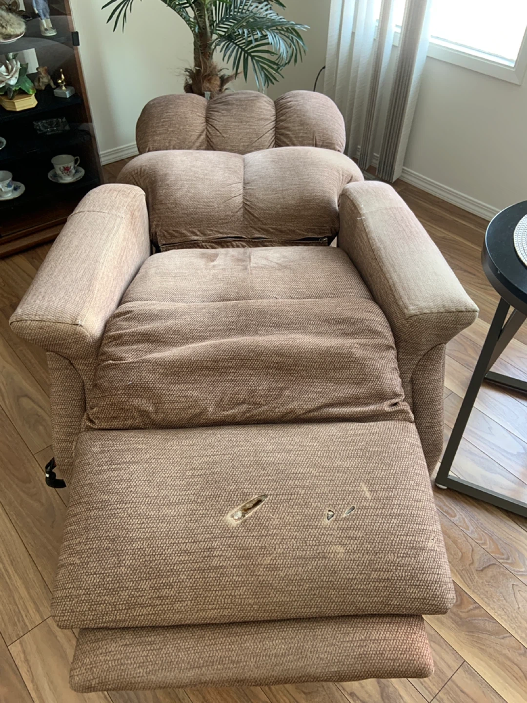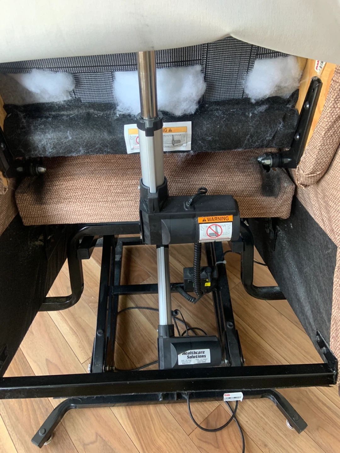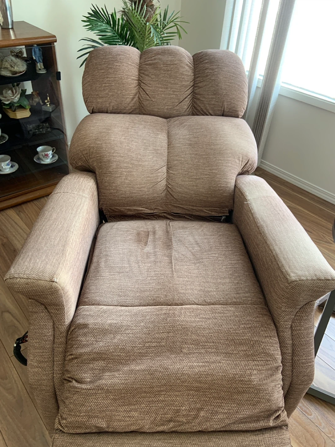 Comfortable Pride lift recliner in a neutral brown fabric. It has a wired remote for easy operation of the lift and recline functions. The chair is in good working order, though there is some wear on the footrest.