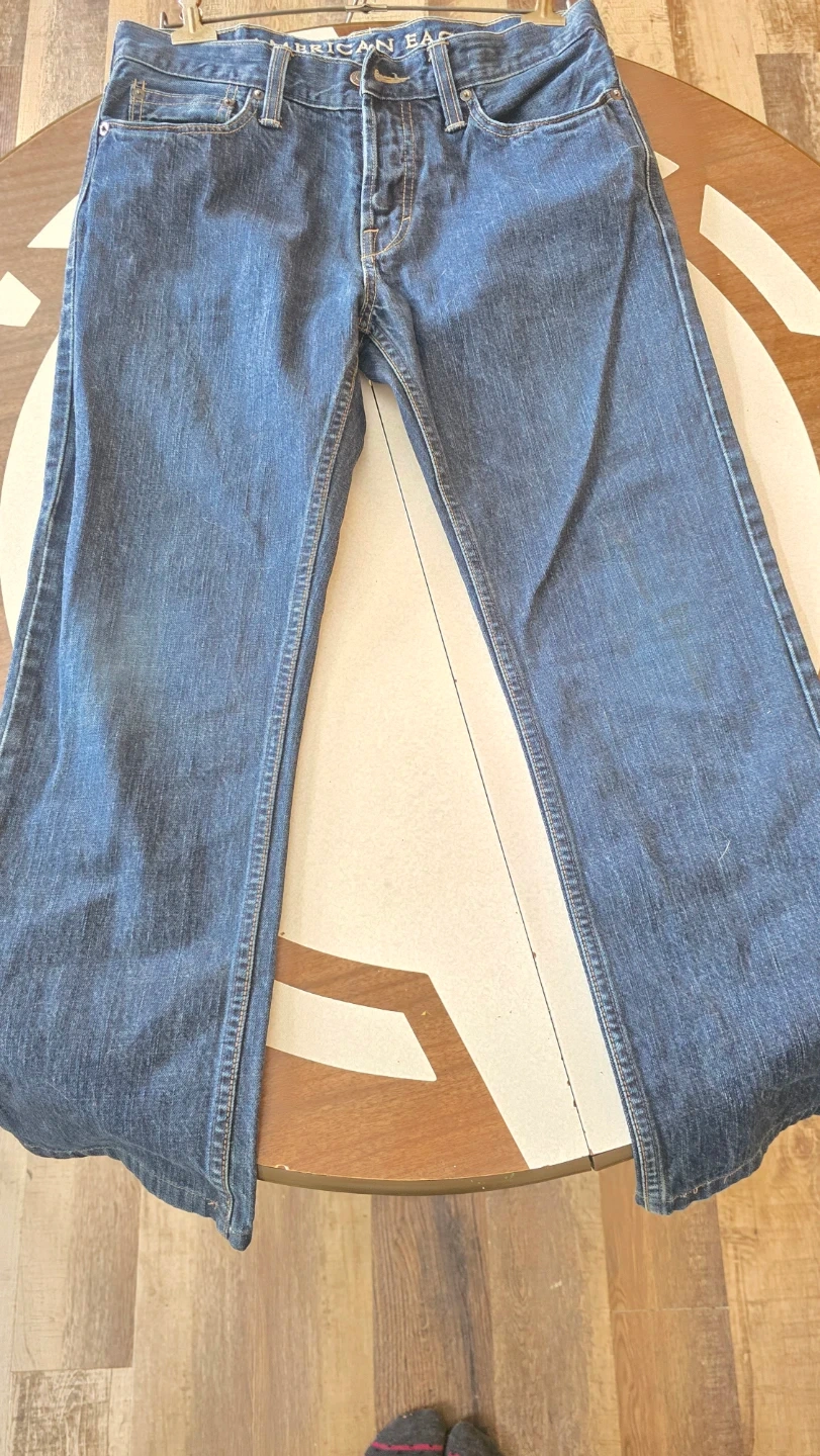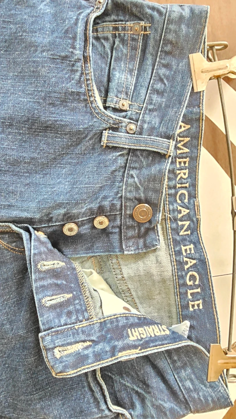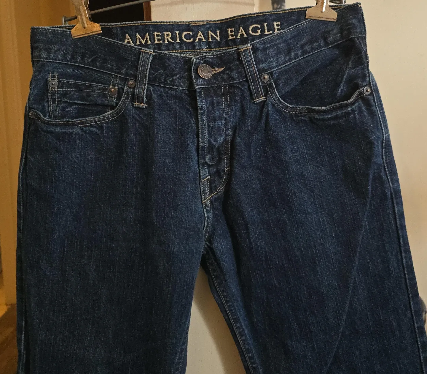 Dark wash denim jeans from American Eagle. Straight fit with a button-fly closure. Classic five-pocket styling. These jeans are a versatile addition to any casual wardrobe! Don't miss out on this amazing offer. Add this item to your collection.