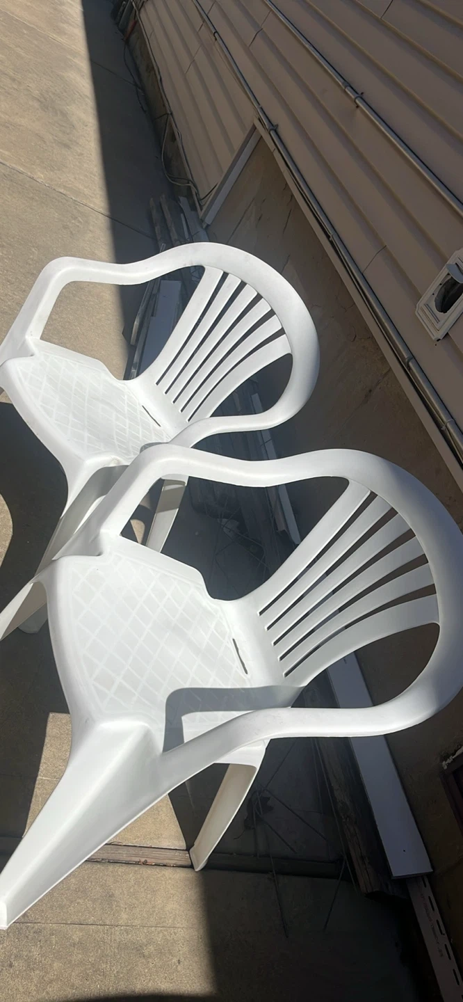 Two white plastic patio chairs. These chairs are made of durable plastic and stackable. They're lightweight and easy to move around. Perfect for outdoor seating!