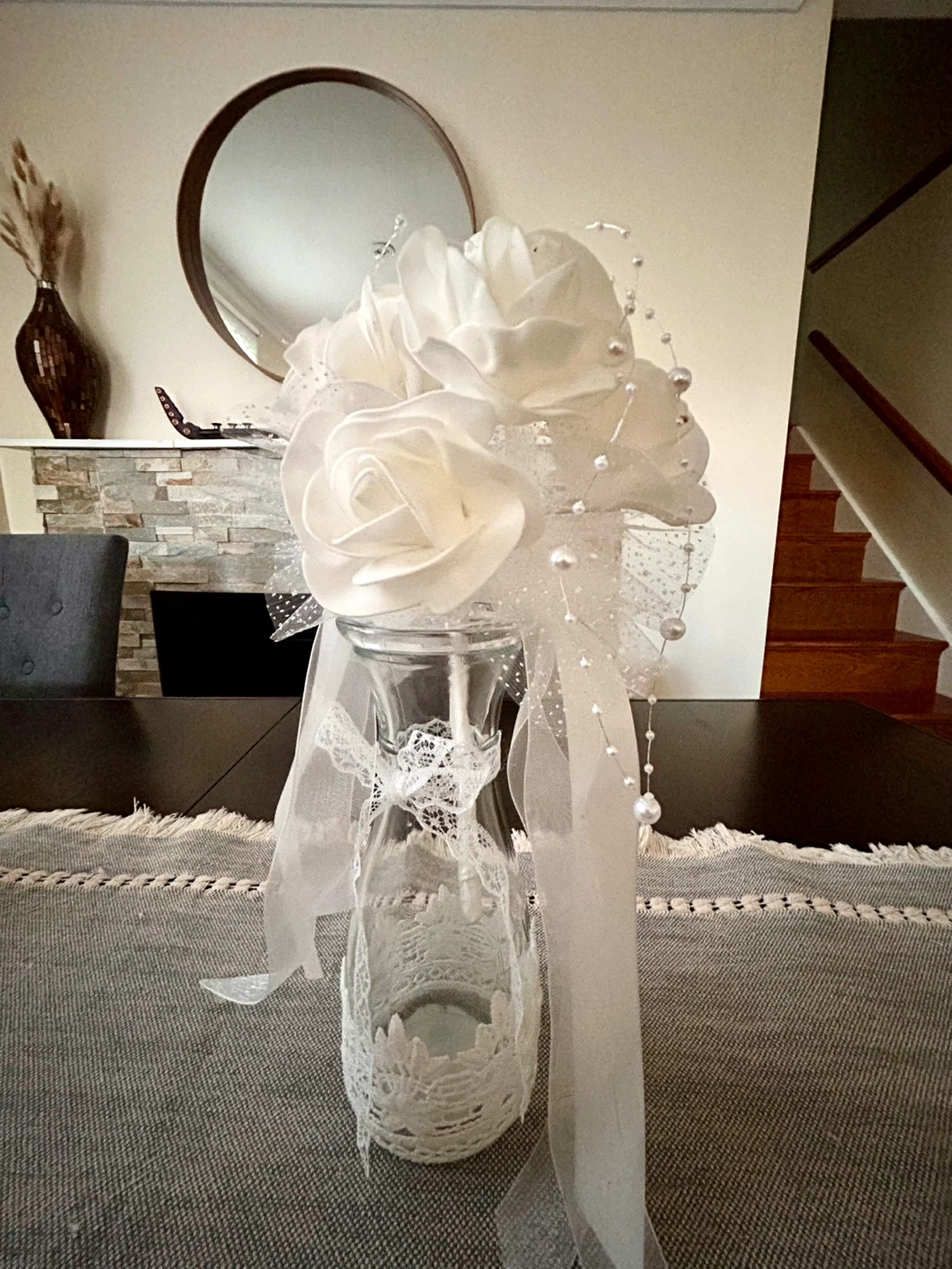 A lovely white floral arrangement in a decorated glass vase. It's adorned with ribbons and faux pearls. This piece would make a beautiful centrepiece for a table or mantle.