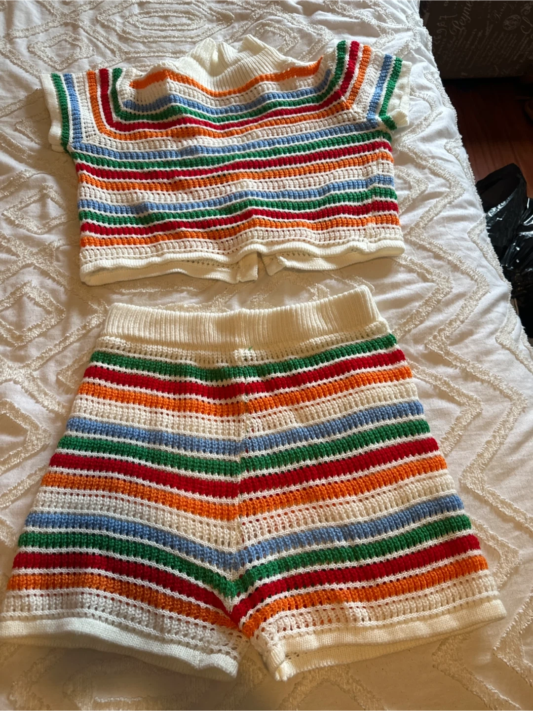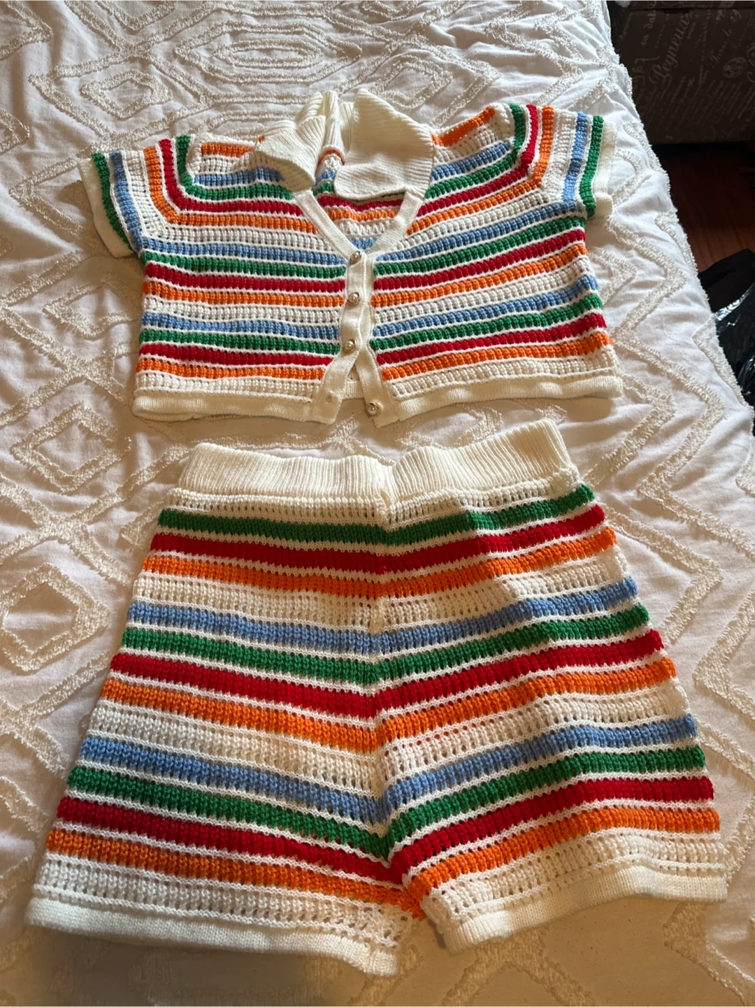 White crocheted set featuring colourful horizontal stripes. Includes a short-sleeved collared top with button closure and matching high-waisted shorts. Material is knit. Perfect for warm weather outfits!