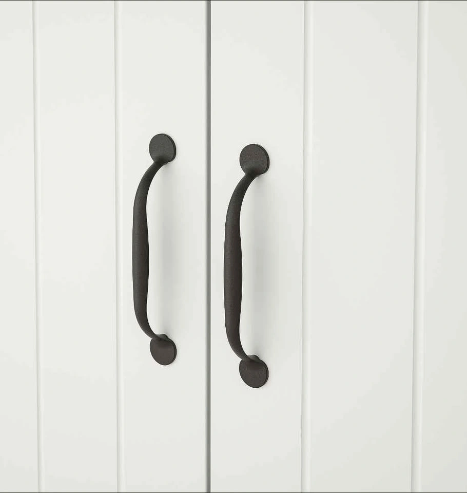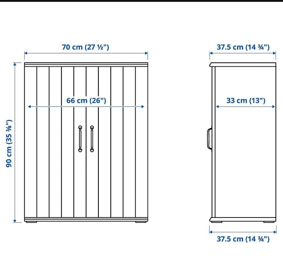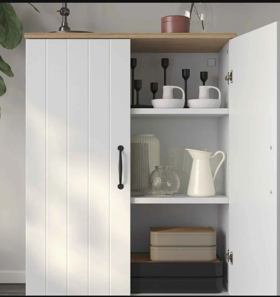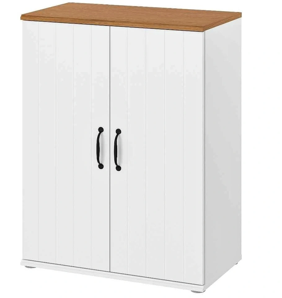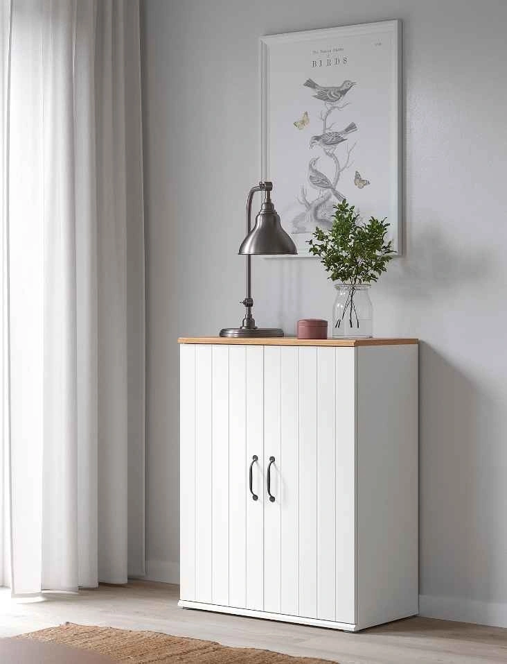 Versatile white cabinet with two doors featuring a vertical paneling detail. It has a light wood-look top and black curved handles, making it suitable for storage in any room. The oak-effect top panel adds a warm, natural look. Includes 2 movable shelves for adjustable storage. Keep belongings hidden and dust-free behind the doors. The surface is durable and easy to clean. Dimensions: Depth 37.5 cm (14 3/4"), Height 90 cm (35 3/8"), Width 70 cm (27 1/2"). Max load per shelf: 15 kg (33 lb).