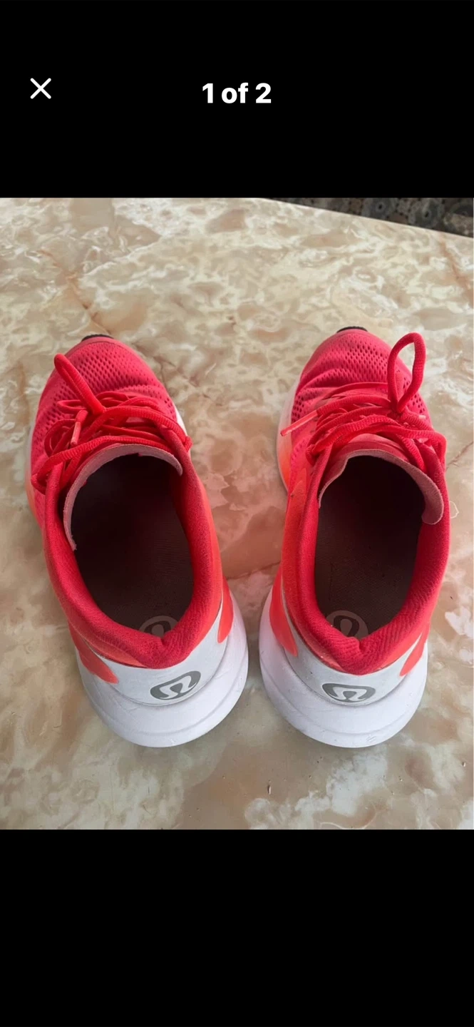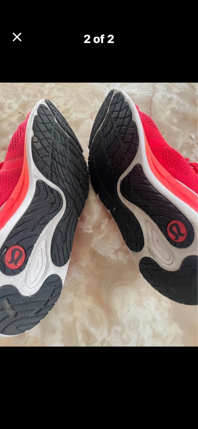 These Lululemon running shoes are a vibrant red colour. They're designed for comfort and performance. Good for your daily runs or gym workouts!