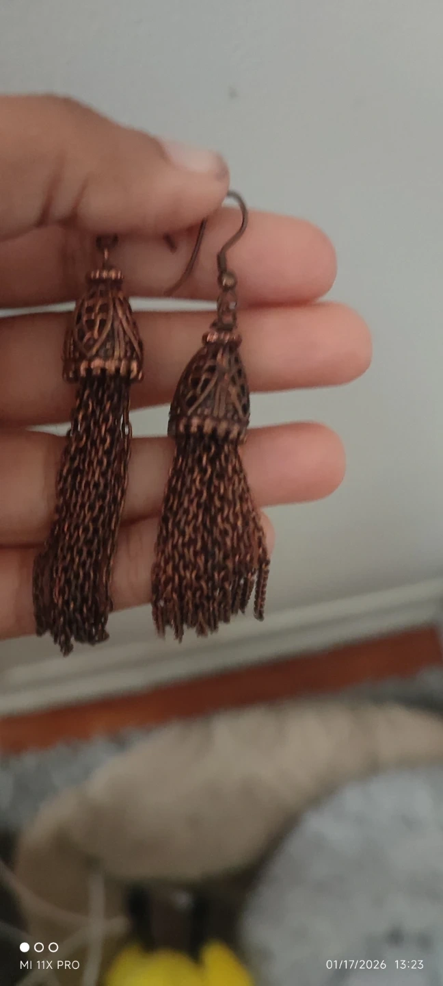 These copper-toned earrings feature intricate bell tops with dangling chain tassels. They're lightweight and add a bit of flair to any outfit. Perfect for adding a bohemian touch to your look!