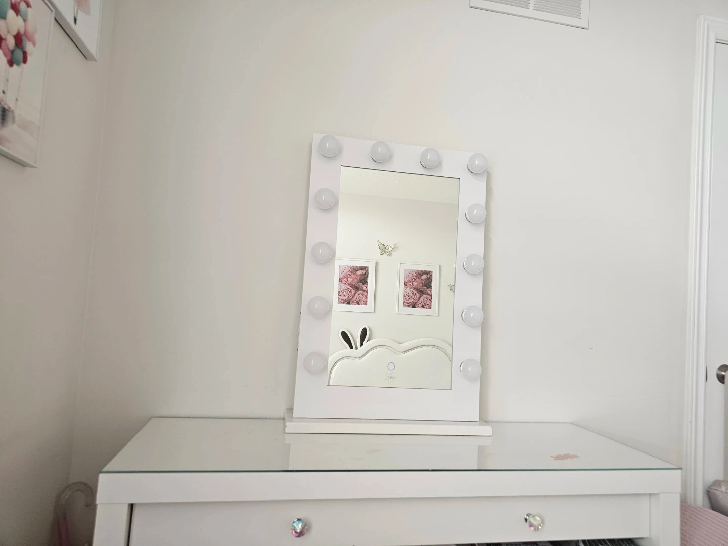 White vanity and mirror with 10 LED bulbs. It has a simple on/off switch. This mirror is great for makeup application.