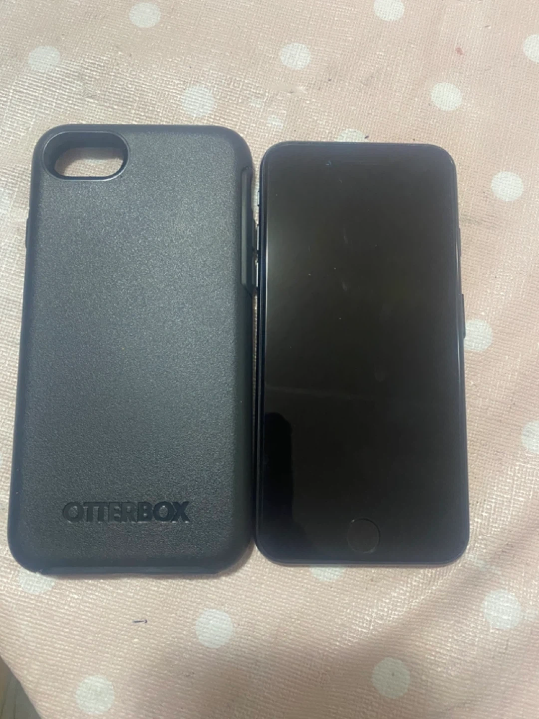 Black iPhone with a black OtterBox case. This phone has been factory reset and is ready for a new owner. It's in good working condition.
