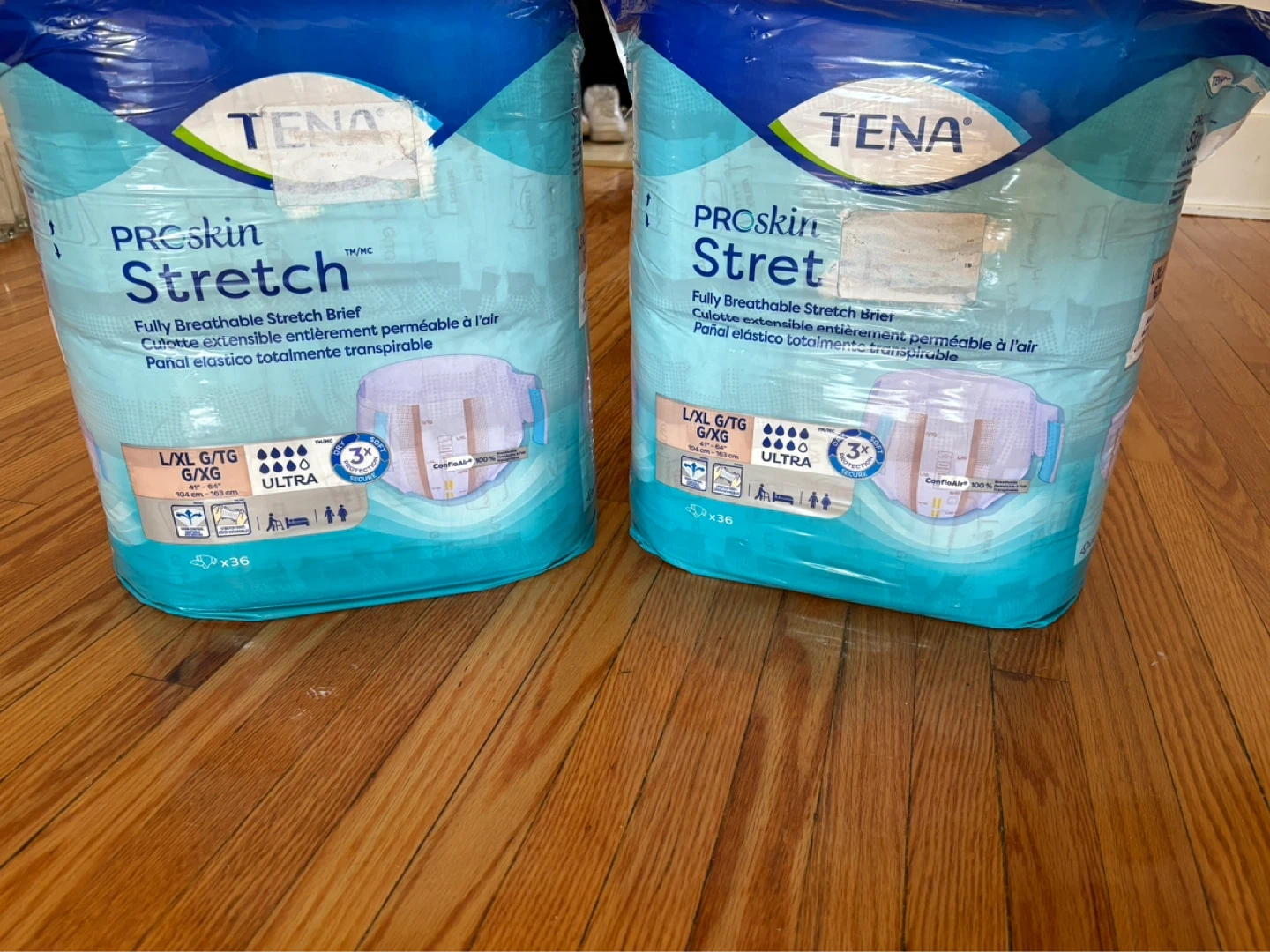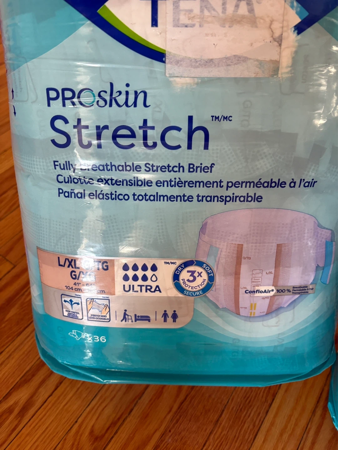 Two packs of TENA ProSkin Stretch briefs. These are fully breathable and offer 3X protection. They're size L/XL, fitting waist sizes 41-64 inches. - Both packages for $80