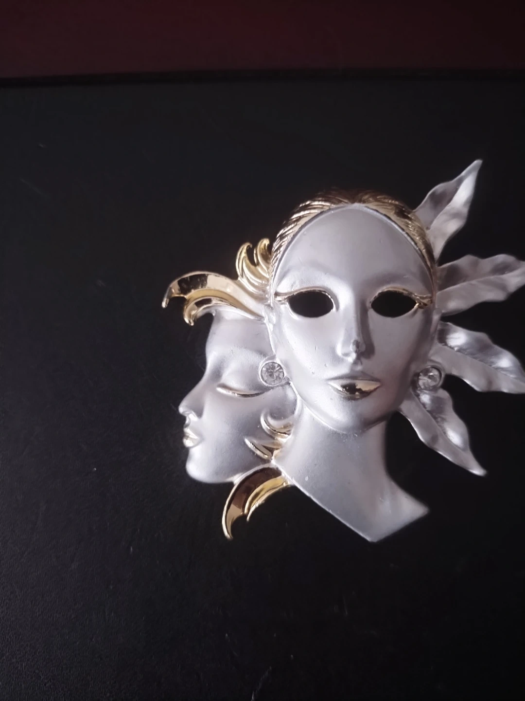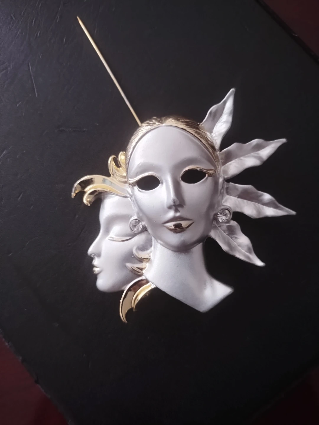 This vintage brooch features a unique masquerade mask design with dual faces. It's crafted from mixed metals with a gold-tone finish and accented with clear rhinestones. A stylish accessory for any occasion!