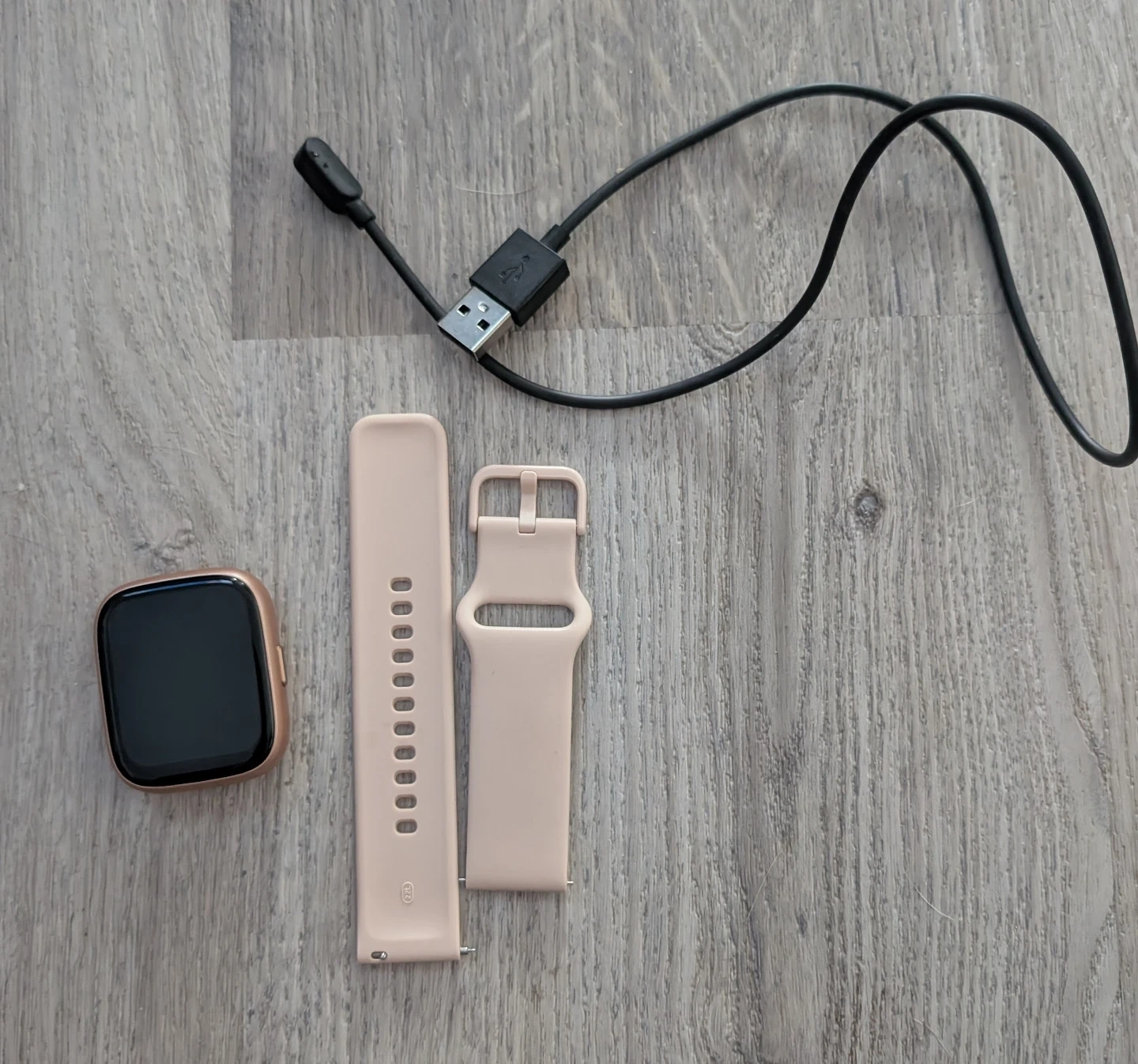 This is a smart watch with a rose gold coloured casing. It comes with two straps and a USB charging cable. The watch displays "Download the "VeryFit" app to your phone from the Google Play Store or the Apple App Store" on startup. It's a sports partner.