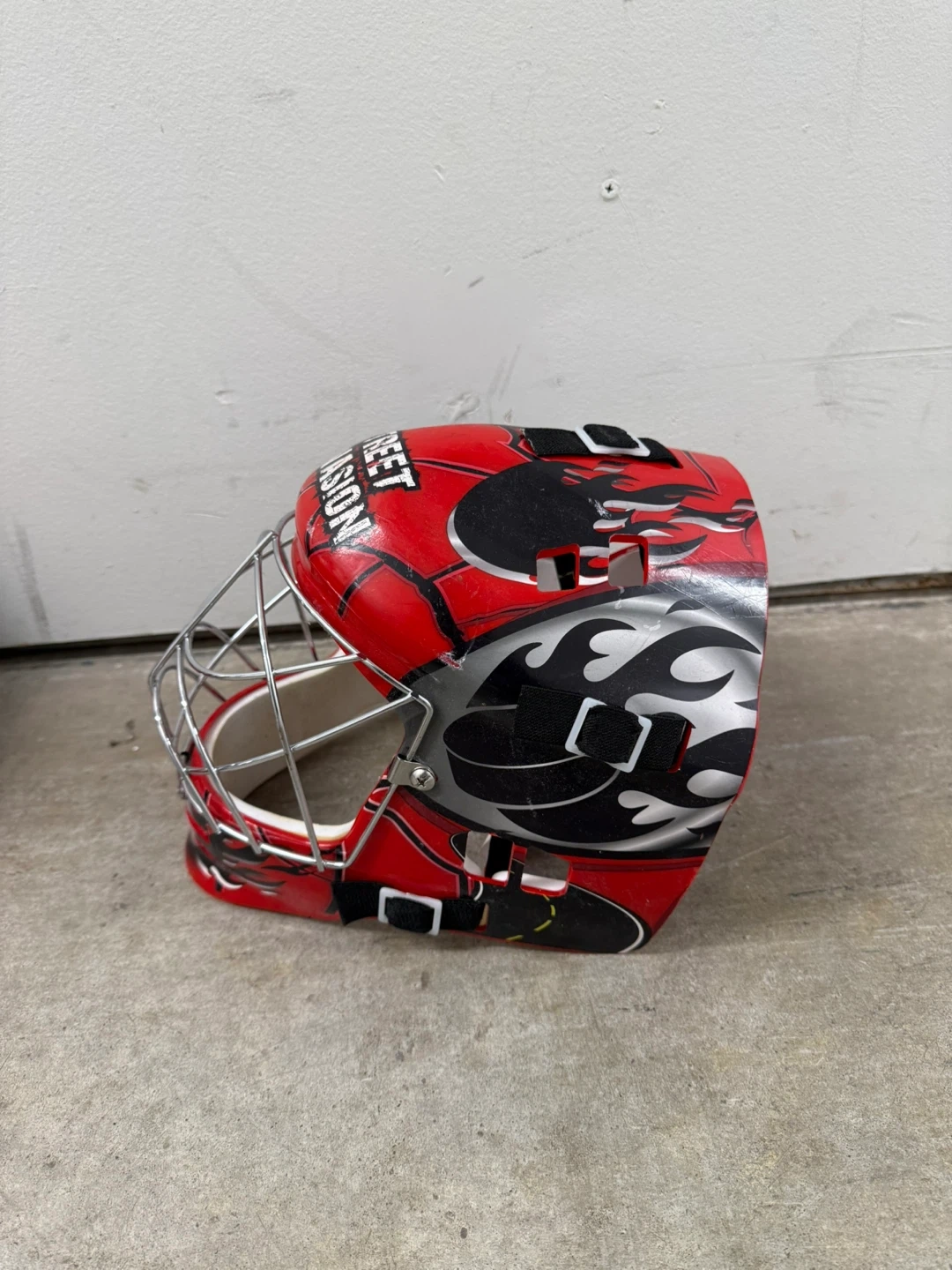 This is a goalie mask with a 'Street Invasion' graphic design. It's a size L. The mask is red with black and silver flame decals. Comes with a metal cage.