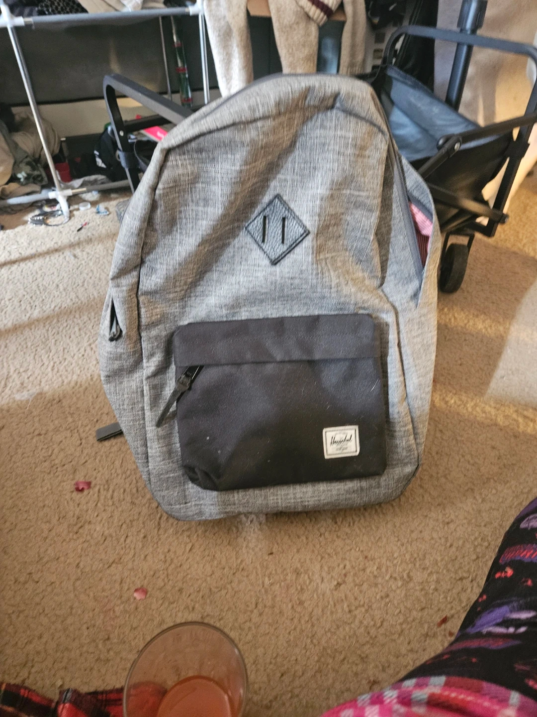 This Herschel backpack is grey with a black front pocket. It features a diamond logo detail and a Herschel label on the front pocket. It's a classic, durable design suitable for everyday use. It's great for school or casual outings!