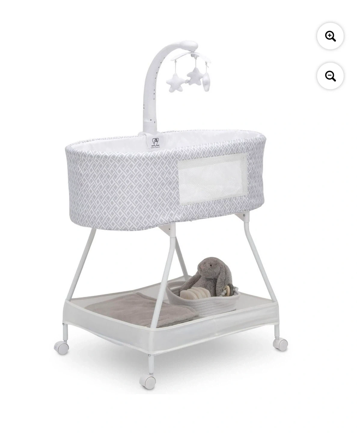 A Delta Children Deluxe Sweet Dreams Bassinet in grey geometric pattern. It includes a mobile with plush stars and a storage basket with a bunny toy. This bassinet is on wheels for easy movement.