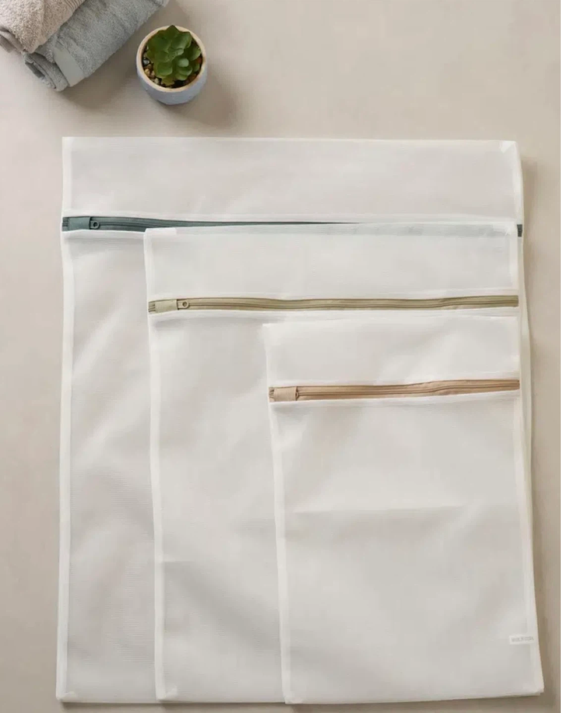 This set includes three mesh laundry bags for protecting delicate clothing during washing and drying. Bags feature zippers for secure closure. Made of polyester mesh material. Includes one large, one medium, and one small bag.