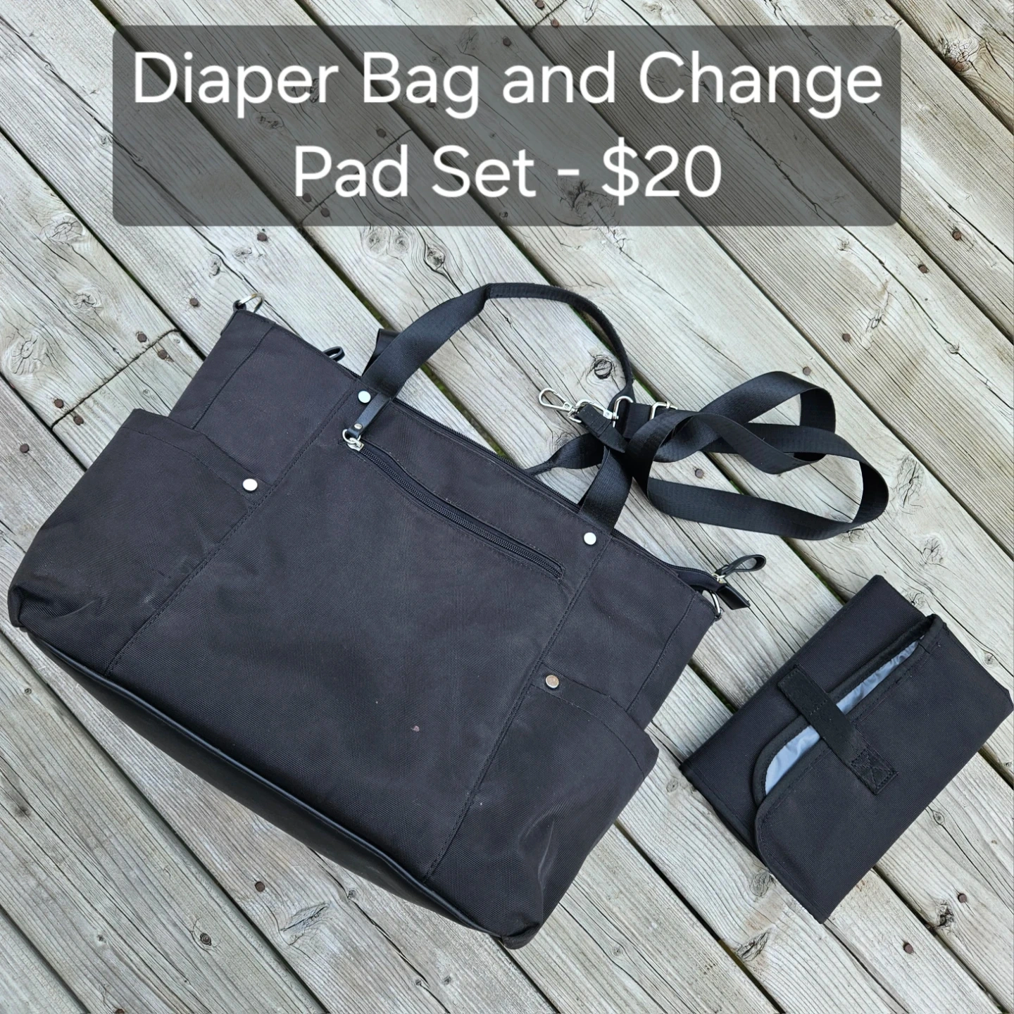 Black diaper bag and matching change pad set. It's made of durable fabric with multiple exterior pockets. The set includes the bag and a foldable changing pad.