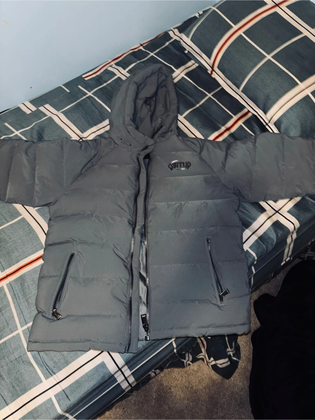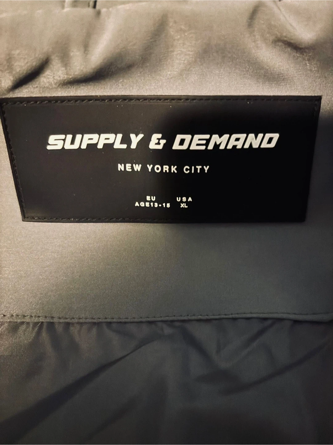 This grey Supply & Demand puffer jacket is a size XL. It features a full zip closure and two front zip pockets. It's a stylish and warm outerwear piece for cooler weather.